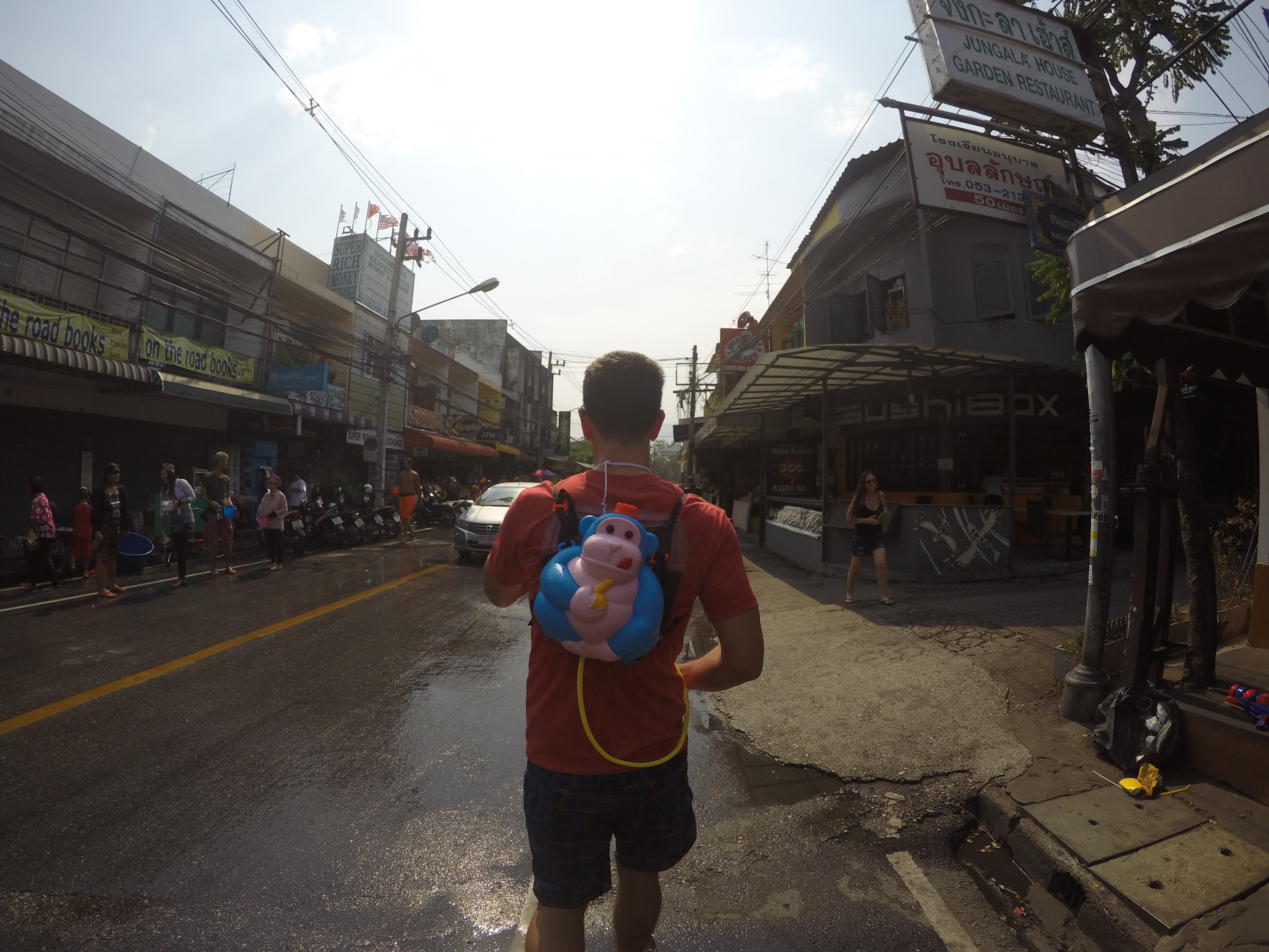 Martin was all excited to finally experience Songkran that he didn’t even mind that I picked him up by a bike so we had to walk through the city and get wet on the way to our hotel. Also he didn’t (almost) mind the fact I provided him with a monkey weapon. We went straight into the center of water fights. I didn’t think I could get more wet but I did. We got soaked to the bone. And many many times…