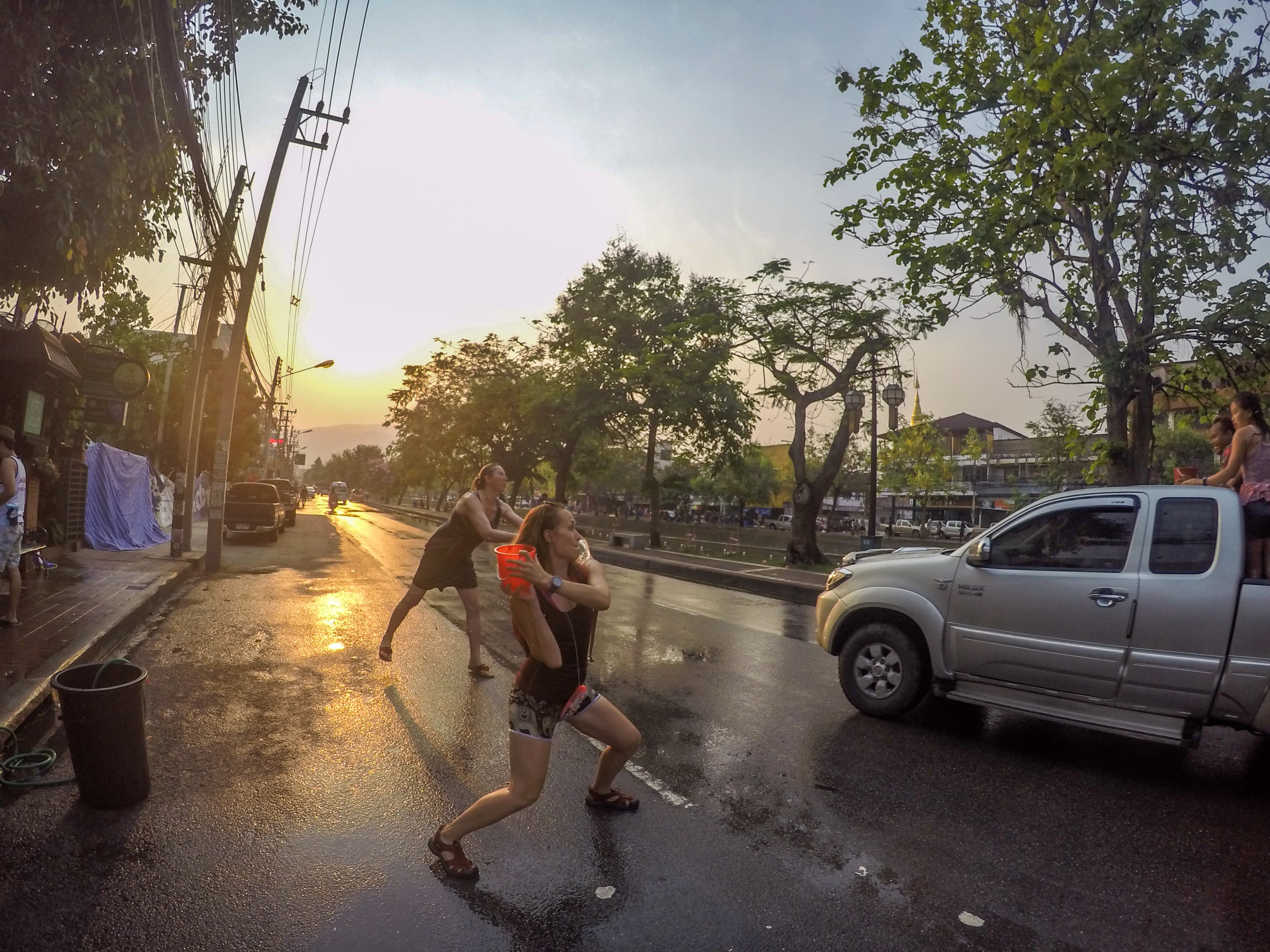 I quickly paid and went out to follow the crowd. There were probably hundreds or maybe thousands of people. You can imagine it is hard to find anyone if you are trying. So it was a great surprise that at the gate I ran into Katie! Katie is a girl I met just two days before at the massage course. She was there with her friend Jonathan. They were also just going for a short walk and planned to get back soon (Jonathan didn’t even wear shoes!). They run into the procession and followed it like me. Together we then continued to walk around, splash water onto people or into tuk tuks all day (Jonathan still with no shoes) and also the next day. I’m so glad I ran into Katie and Jonathan. They were so much fun to hang around. For example when Katie got into a dance fight with a Thai girl (and she did great!) or when Jonathan got drunk from three shots of Slivovice (such a cheap drunk!) and got all funny and nicely silly or when Katie gave Jonathan massage in the restaurant. We separated the third Songkran day when Martin arrived. I hope they are having a great time now.