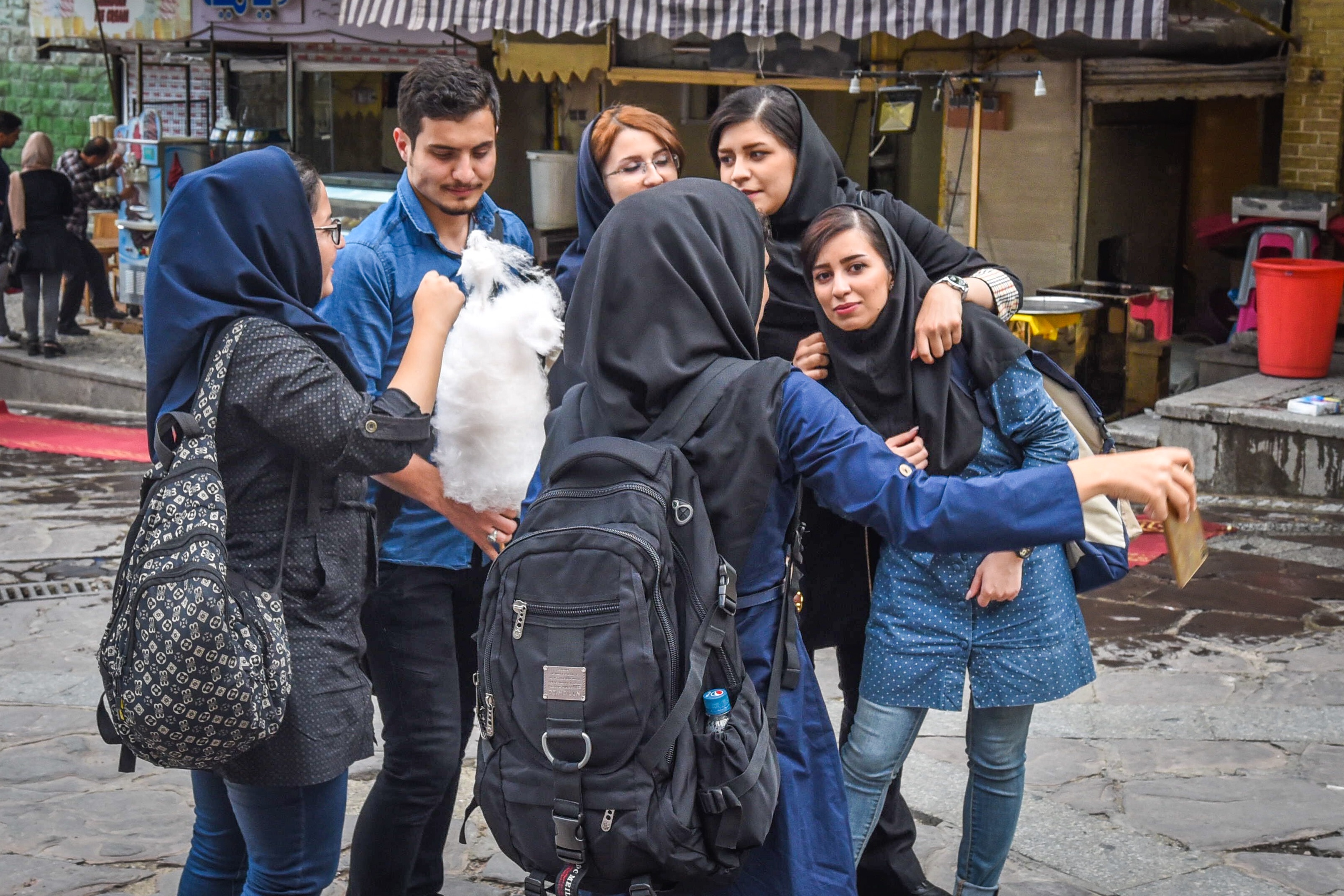 Podle našeho místního spolucestujícího z letadla vypadal můj kambodžský šátek příliš Arabsky a tak jsem si hned první den koupila nový a víc “bjutiful” podle jeho instrukcí. Při výběru mě pomohla skupinka místních parádnic..asi jsem to viditelně potřebovala. Taky jsem zjistila, že nemusím mít vlasy úplně zahalené, nějaké vlasy můžou koukat..A že nejsem zdaleka jediná blondýna. Mladé Iránky si dokonce odbarvují vlasy a nosí všelijak barevné šátky. Většina mladých nosí černý hejab a chador ale musí ho nosit až starší ženy. Tak to by bylo…