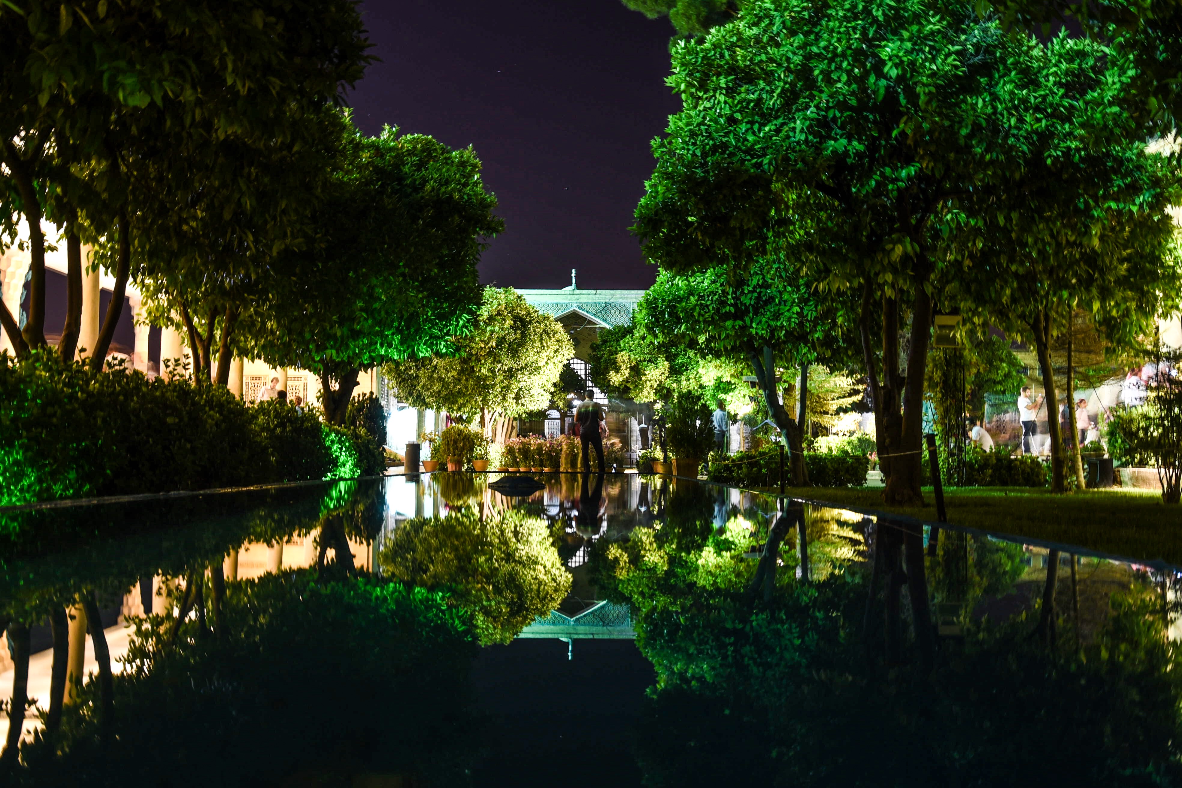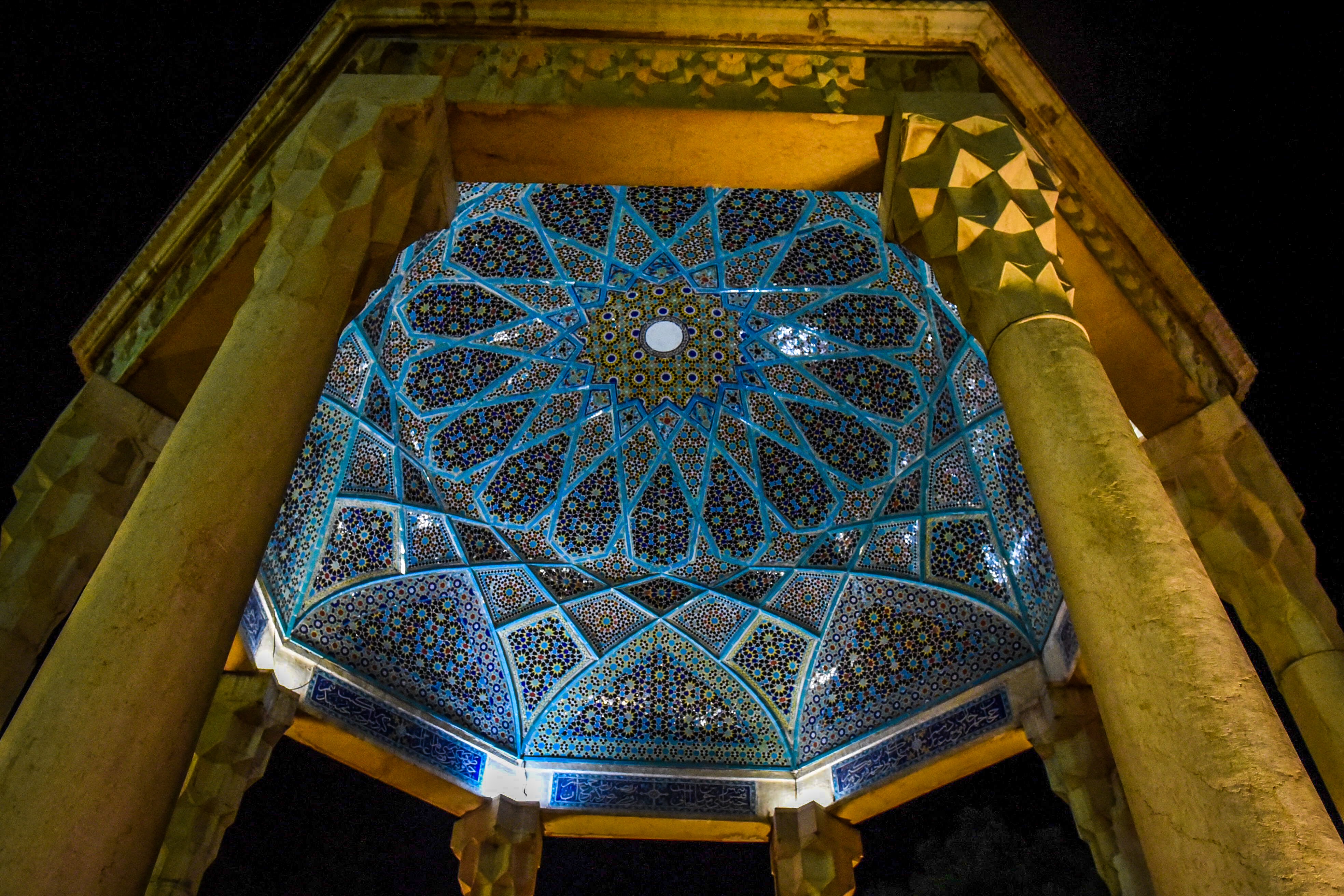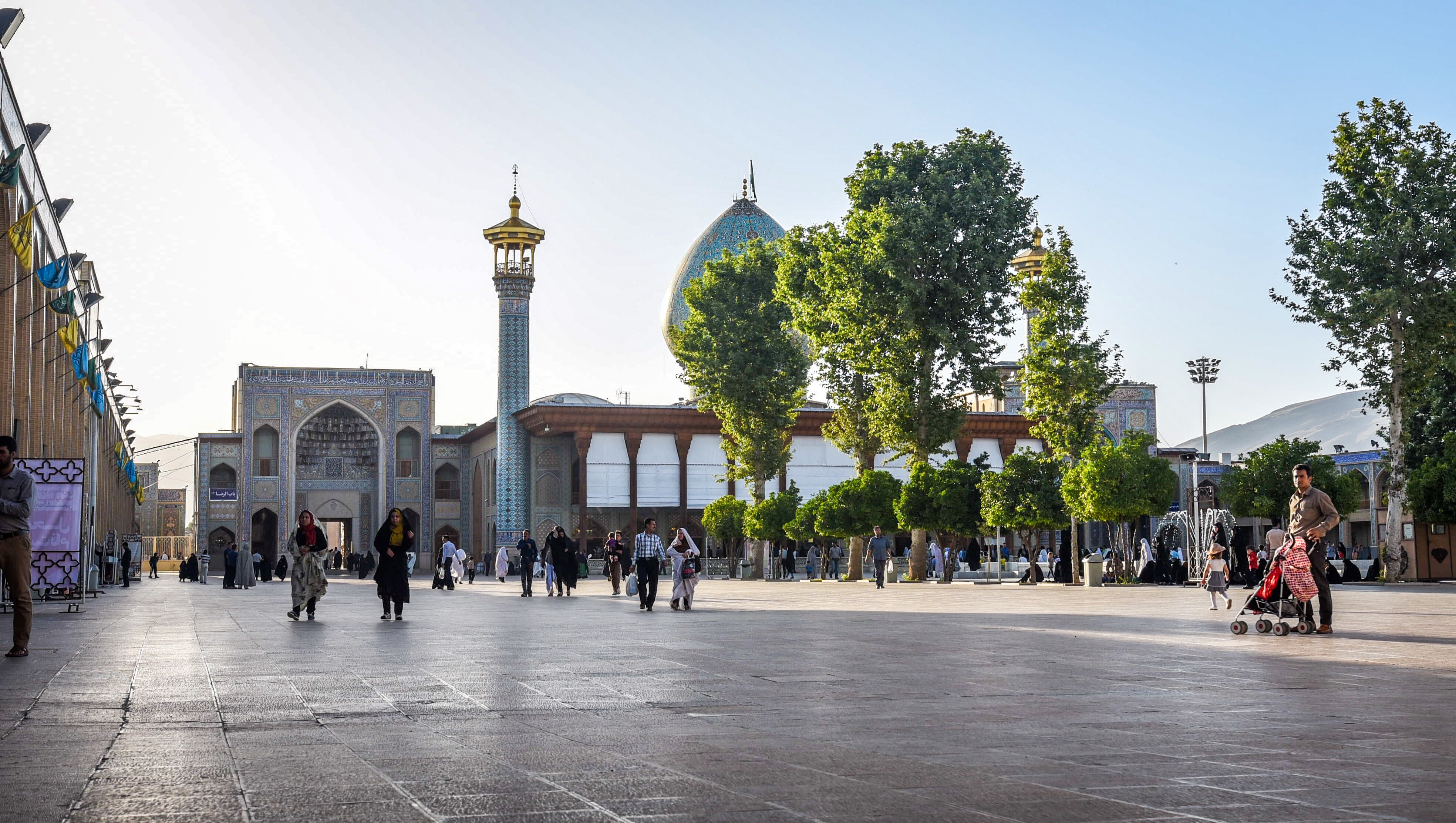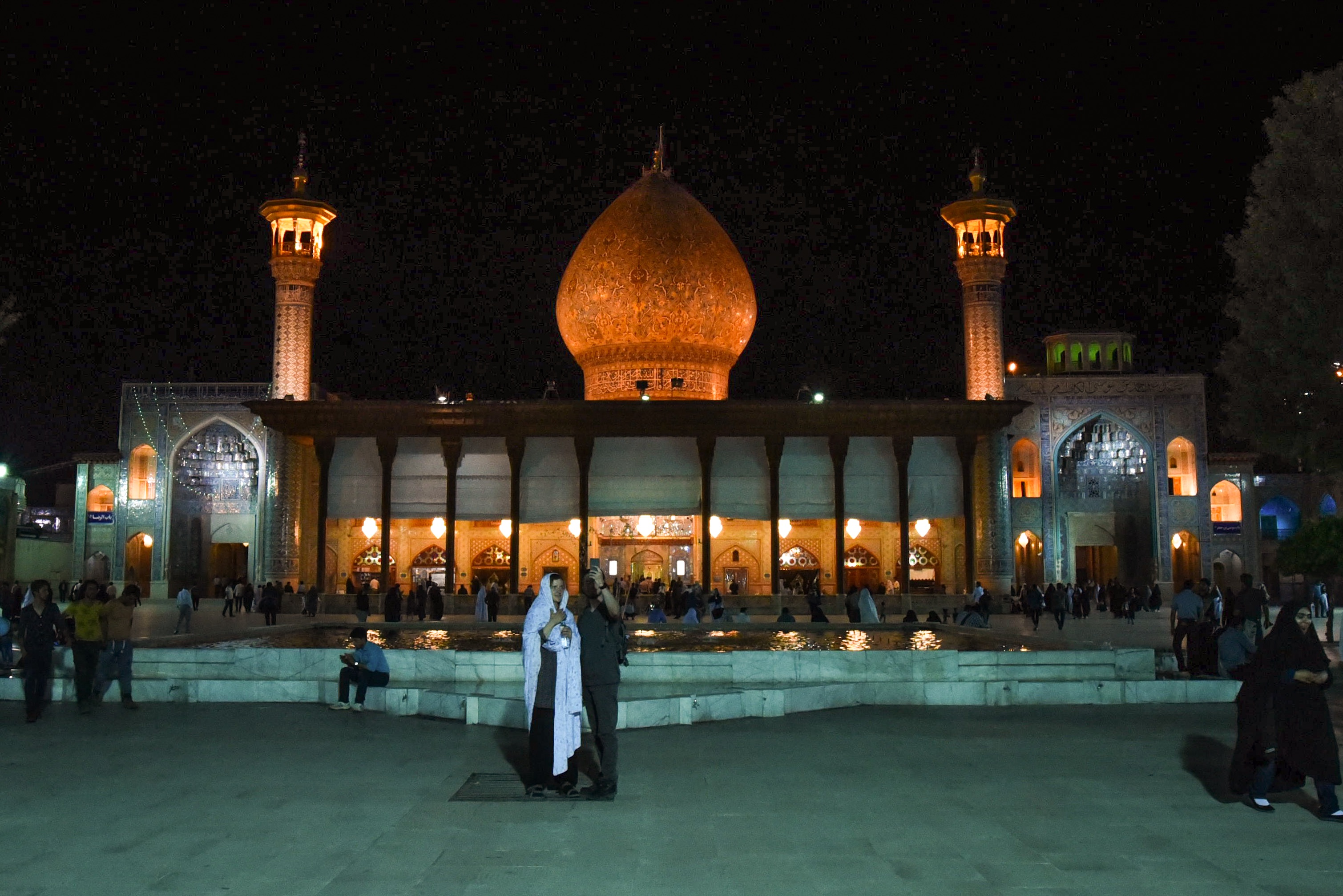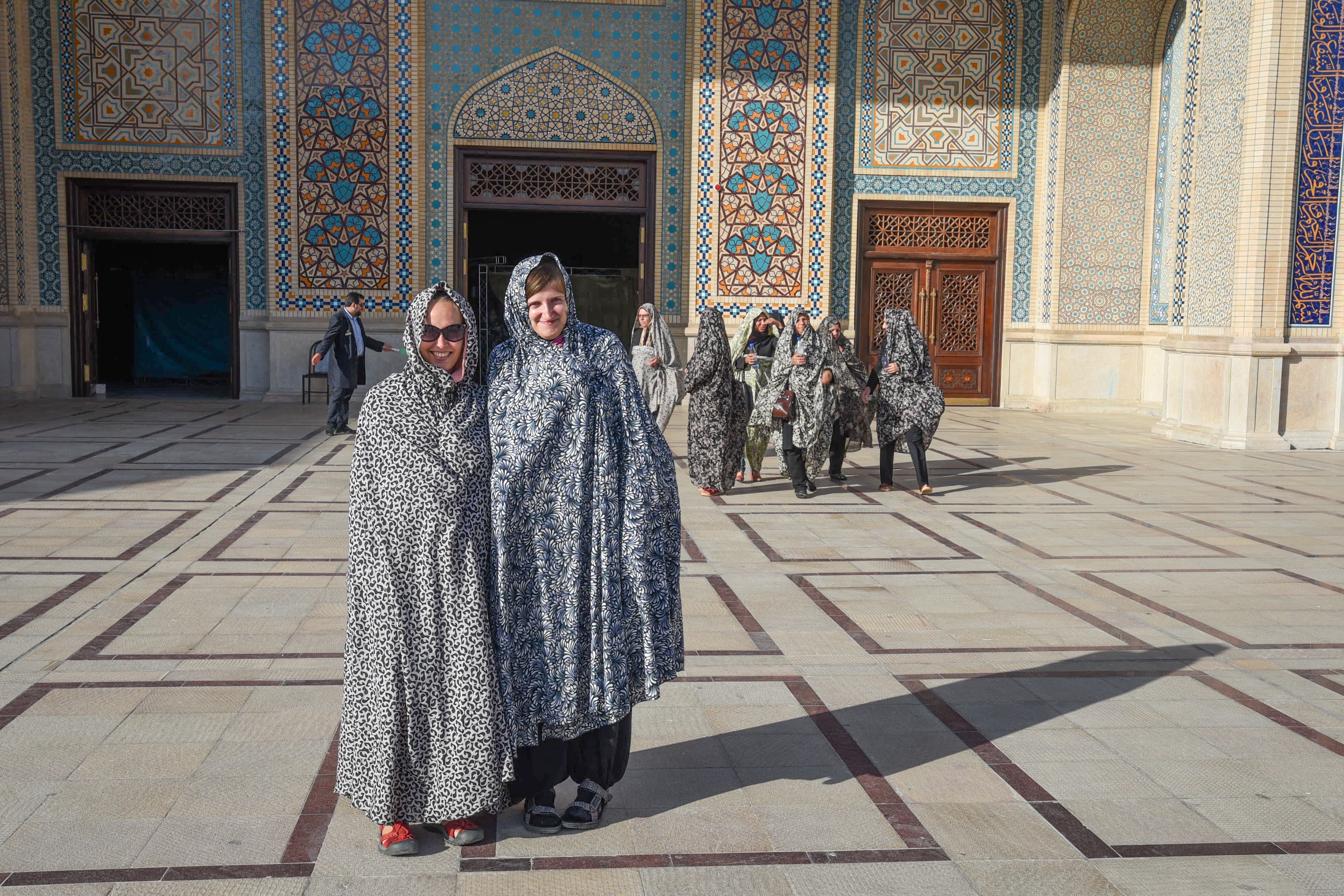 Tahle mešita a mausoleum byla v minulosti pro cizince nepřístupná. Dnes se tu smí chodit za doprovodu průvodce a ženy musí být zahalené v chadoru, který jsme dostali zdarma u vchodu. Chador v tomhle vedru je obvzlášť šťavnatý zážitek. Nesmí se tu fotit (tedy ne foťákem ale mobilem ano)..Je tu otevřeno i v noci a právě za tmy je prý úžasně nasvícená. Na to jsme byli hodně zvědaví, takže jsme se sem vrátili a ochranka nám povolila jedno foto za přítomnosti jejich profi fotografa. Během naší denní prohlídky jsme mohli obdivovat nádherně zdobený vnitřek mešity, celý ze zrdcadel, které prý odráží myšlenky.