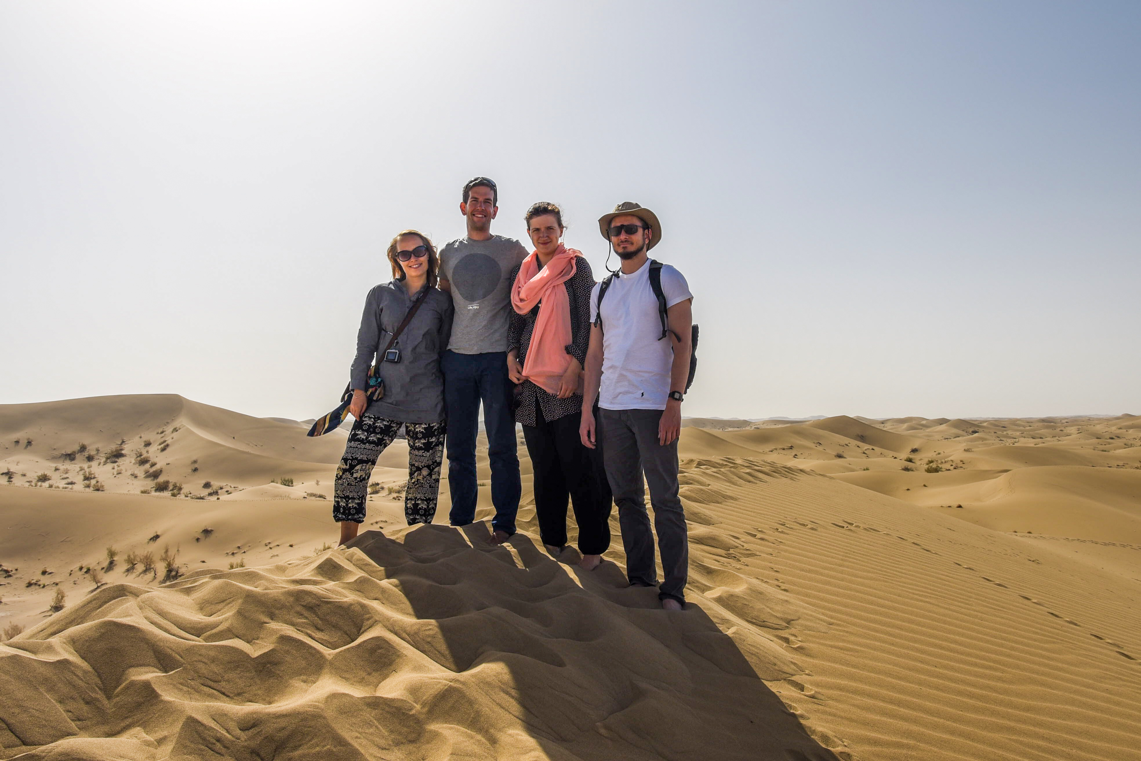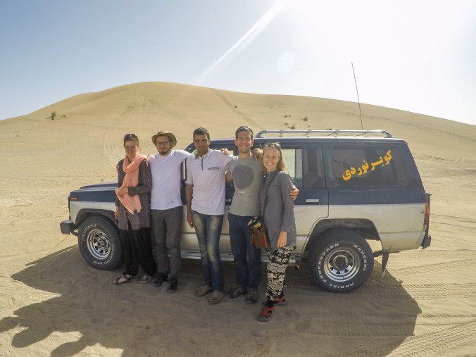 Jednou u snídaně za námi přišel nějaký průvodce a nabízel nám různé jednodenní výlety. My jsme zrovna přemýšleli o výletu do města Yazd a on nám nabídl, že to můžeme vzít přes poušť, která je téměř po cestě. Tak jsme se nadchli a souhlasili aniž bychom si zkontrolovali jak přesně daleko to všechno je. Říkali jsme si, že on je přece průvodce a ví co a jak. Ale Yazd je bez zajížďky na poušť 340km autem, které v pěti lidech zajišťuje blízké a horké tulení v autě, kde už tak je vedro. Takže plán byl zabijácký. Vyrazili jsme v šest hodin ráno abychom stihli poušť v době, kdy je tam ještě chladno. Vyšplhali jsme se na nejvyšší kopec stylem tři kroky nahoru a dva zpět ale nakonec jsme se tam dostali a za odměnu jsme dostali od pana průvodce melouna. Následně jsme si objednali jízdu offroadem. Zpočátku jsme váhali ale pak jsme byli docela nadšení a ukázalo se, že to byl highlight našeho výletu.