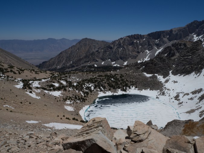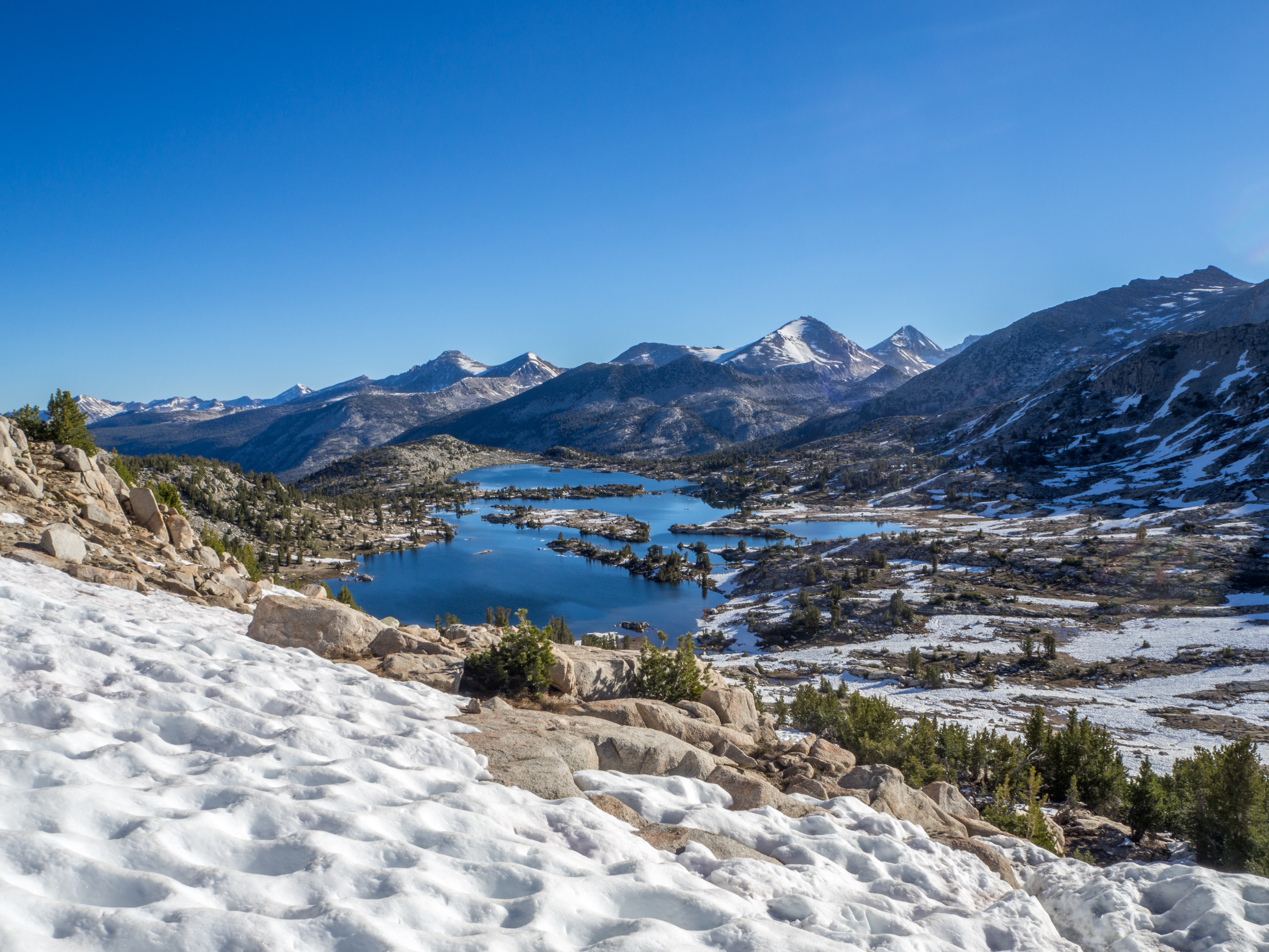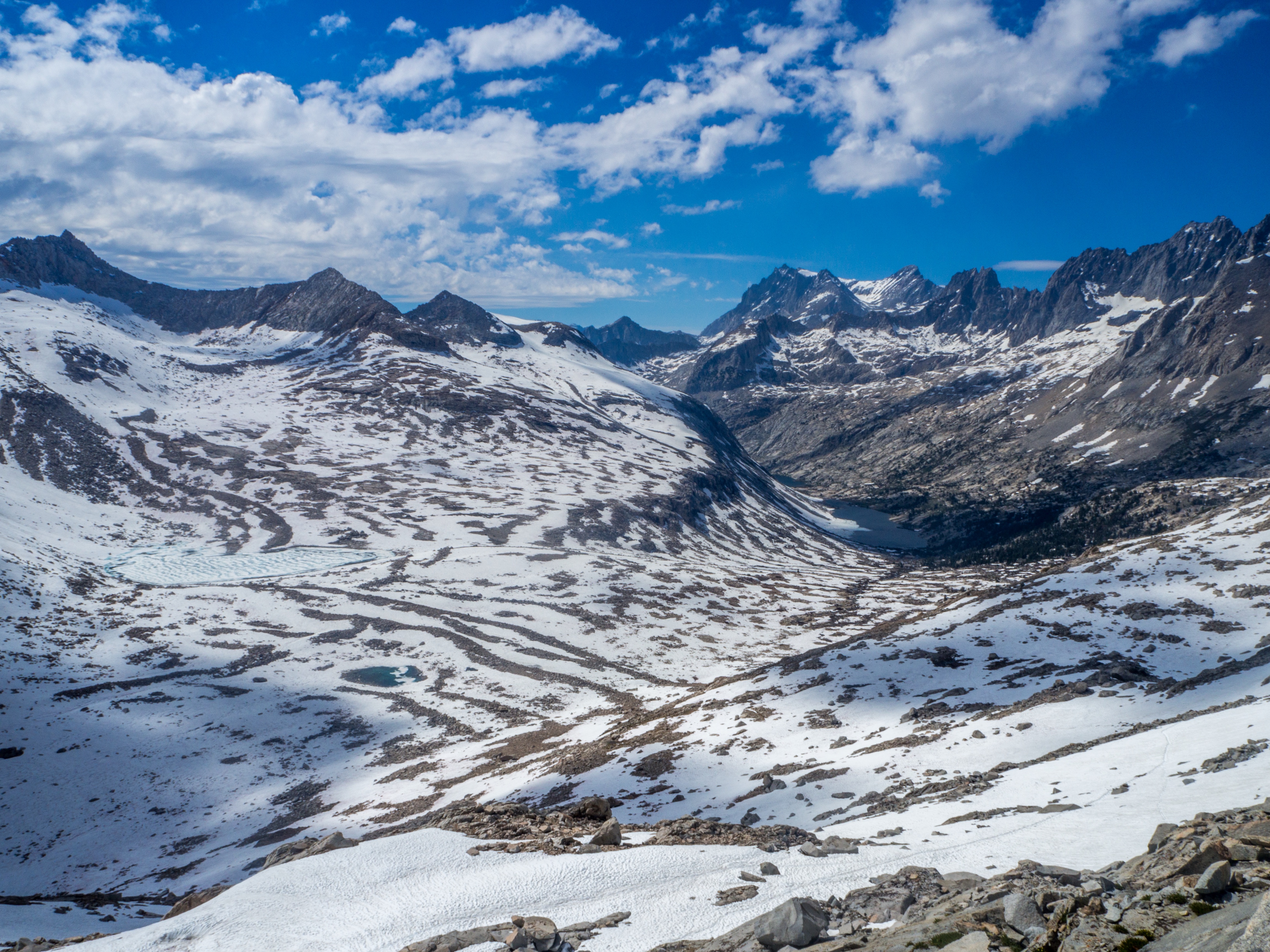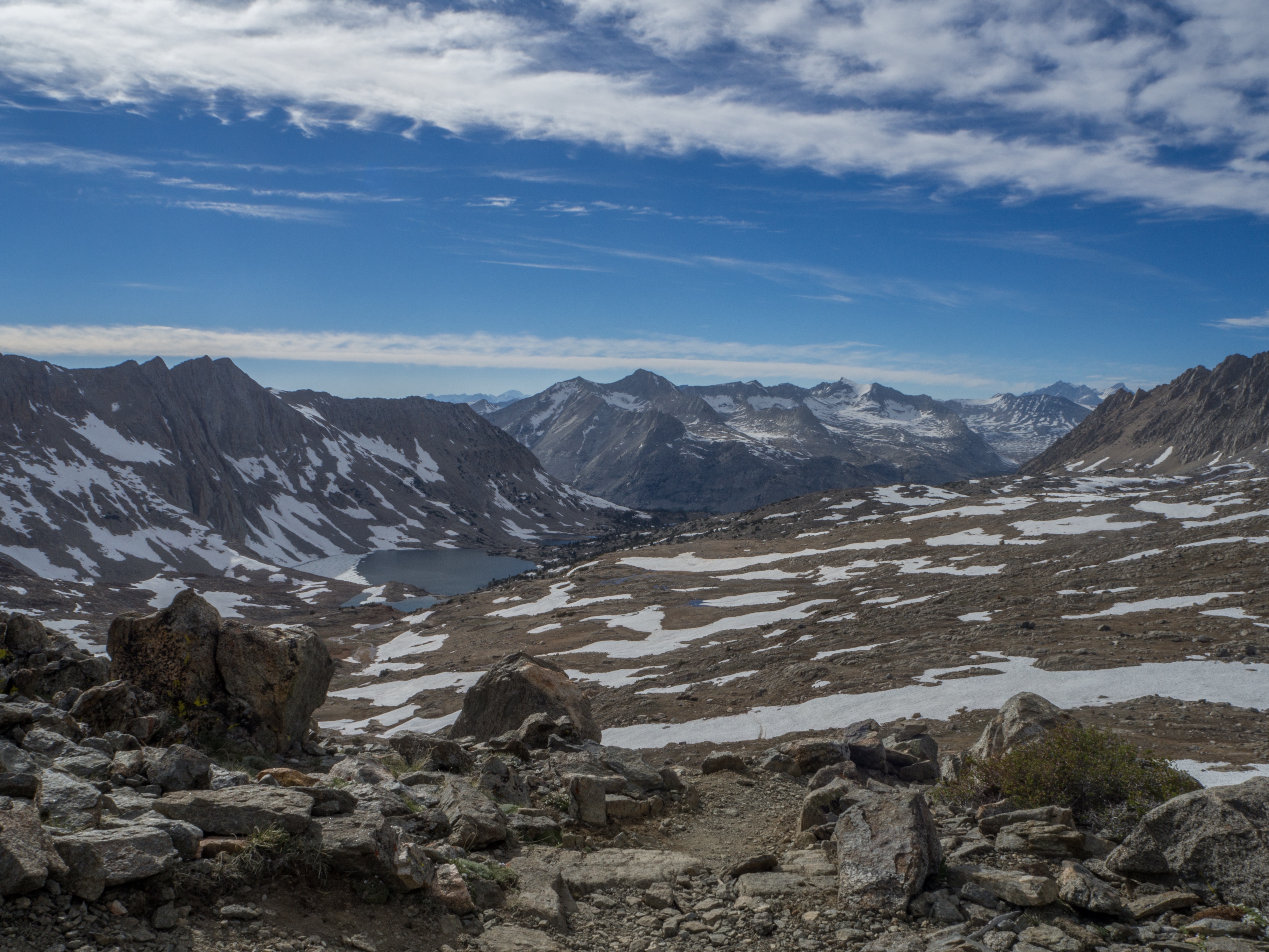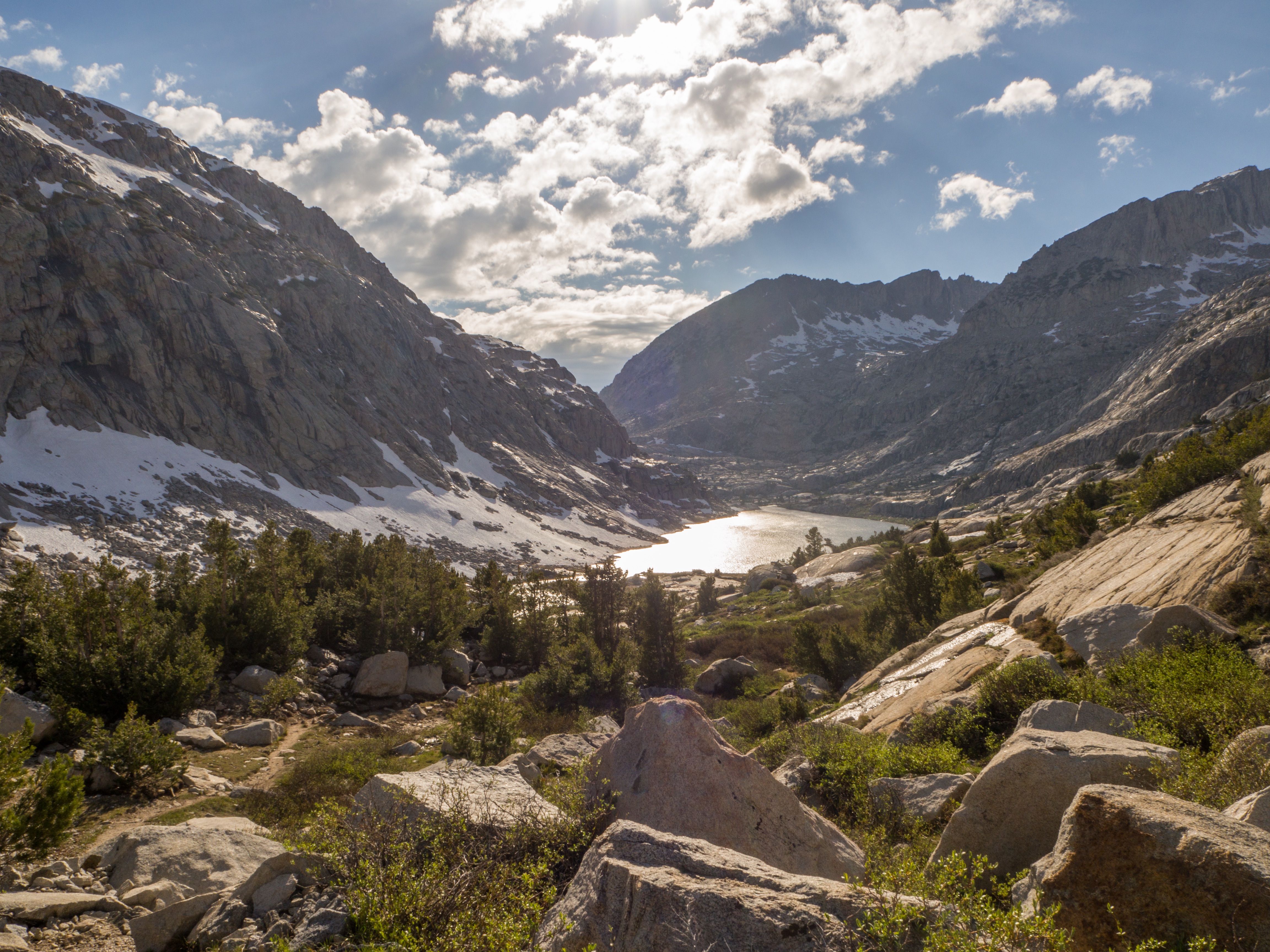 Druhý den ráno vyrážíme vstříc průsmyku Glen pass (3630m). Po cestě potkáváme potůček s vodou a konečně se můžeme pořádně napít. Martin tam ještě hází tabletu magnezia. Výstup je hodně příkrý, všude je sníh. Jsme opravdu rádi, že jsme den předtím nešli nahoru. Na druhé straně průsmyku je taky spousta sněhu, tak jsme se poprvé svezli dolů po zadku. Čeká nás dlouhý 14km sestup do výšky 2600m. Očekávali jsme, že sestup bude brnkačka a tak to bude fain a jednodušší den. Nemohli jsme se ale víc mýlit. Ze začátku byla cesta hodně kamenitá a nedalo se jít víc než 1,5km za hodinu. Procházíme kolem jezer Rae v kterých se krásně zrdcadlí hory. Zpětně nás mrzí, že jsme tak spěchali a nezastavili se na vykoupání nebo na svačinu. Je to jedno z nejkrásnějších míst.
