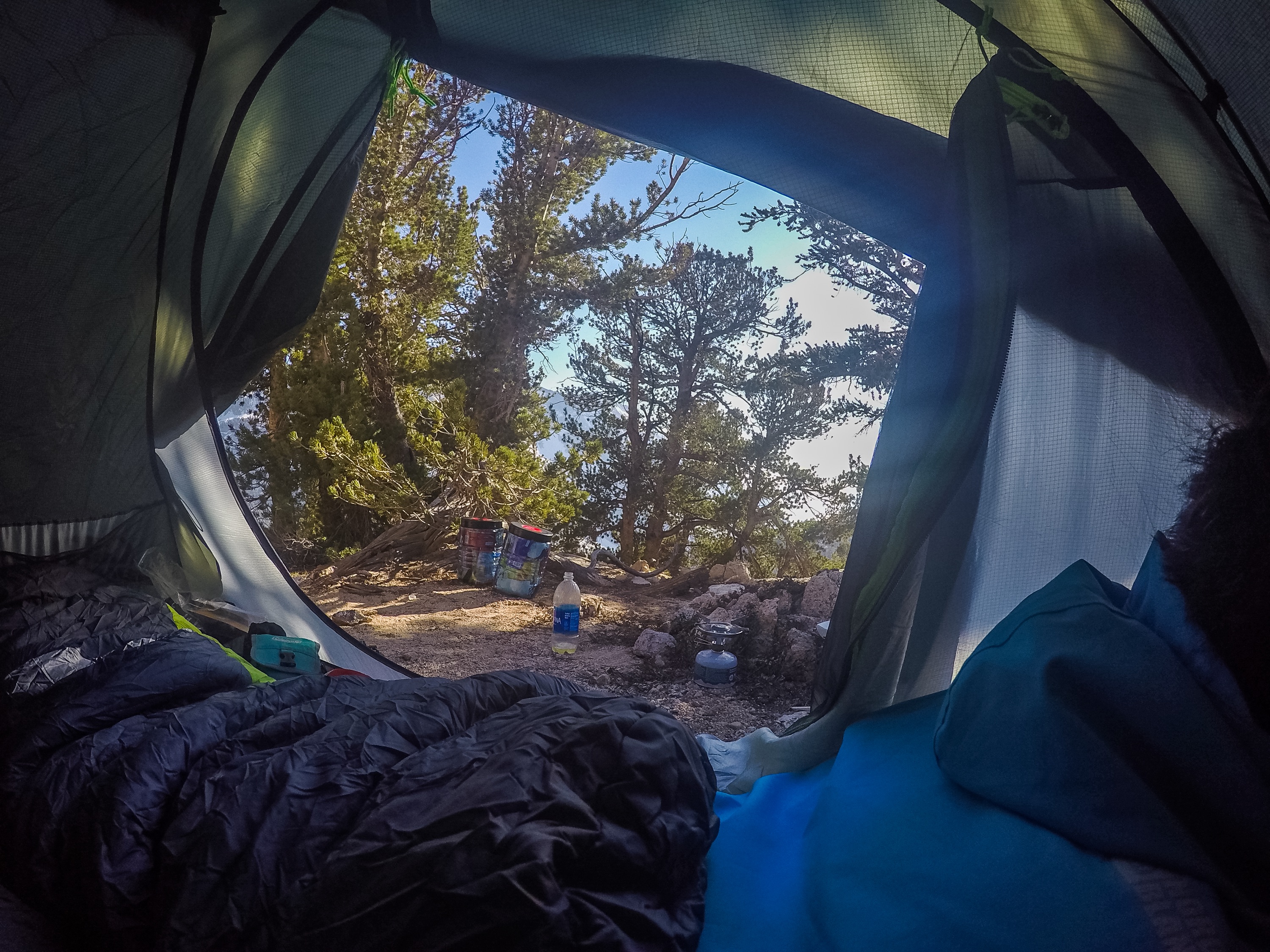 V noci se budíme, je nám zima. Přes den je okolo 20-25 C ale v noci teplota padá až na -6C, obvzlášť tak vysoko jako dnes kempujeme. Taky mě budí strach. Každé zašustění mého spacáku se zdá jako šustění mědvěda, který se snaží dostat do naší mědvědům resistentní tašky s jídlem.