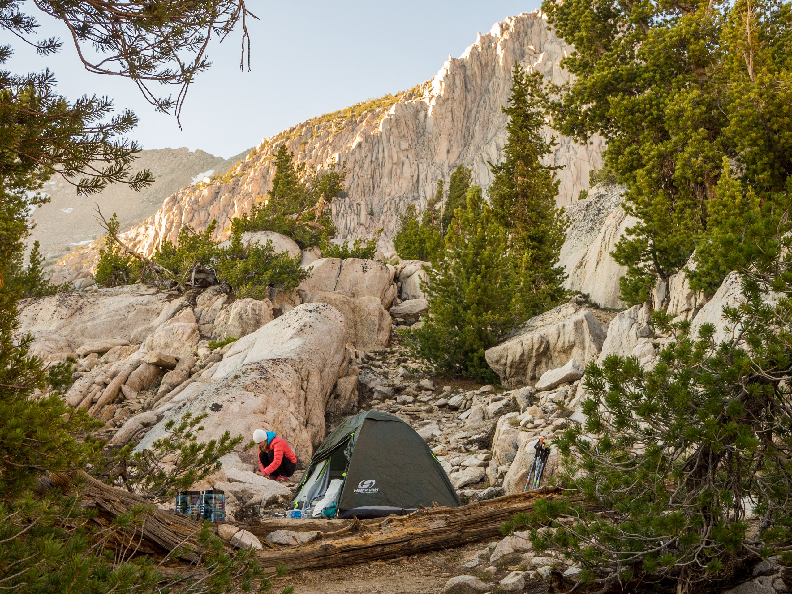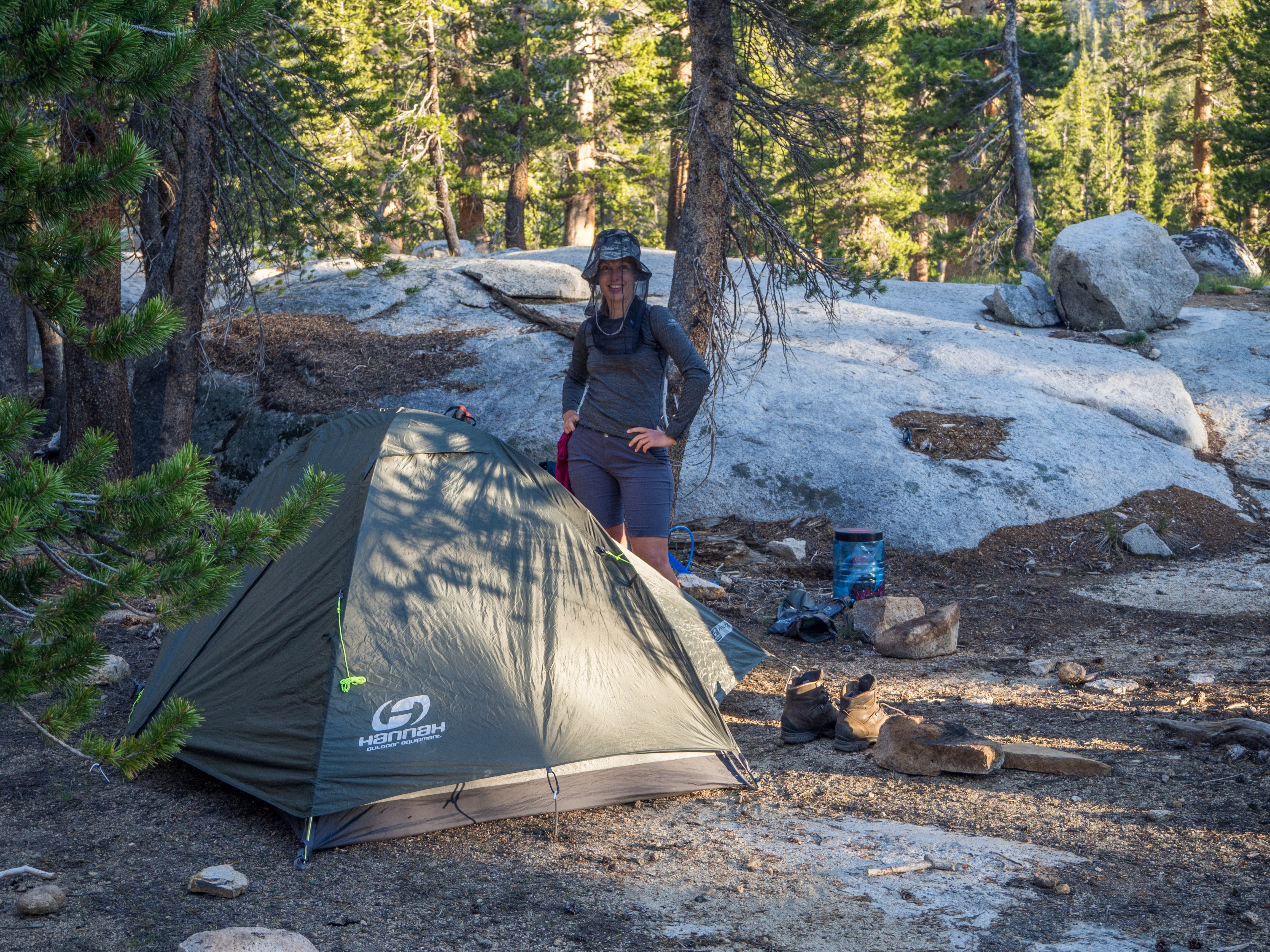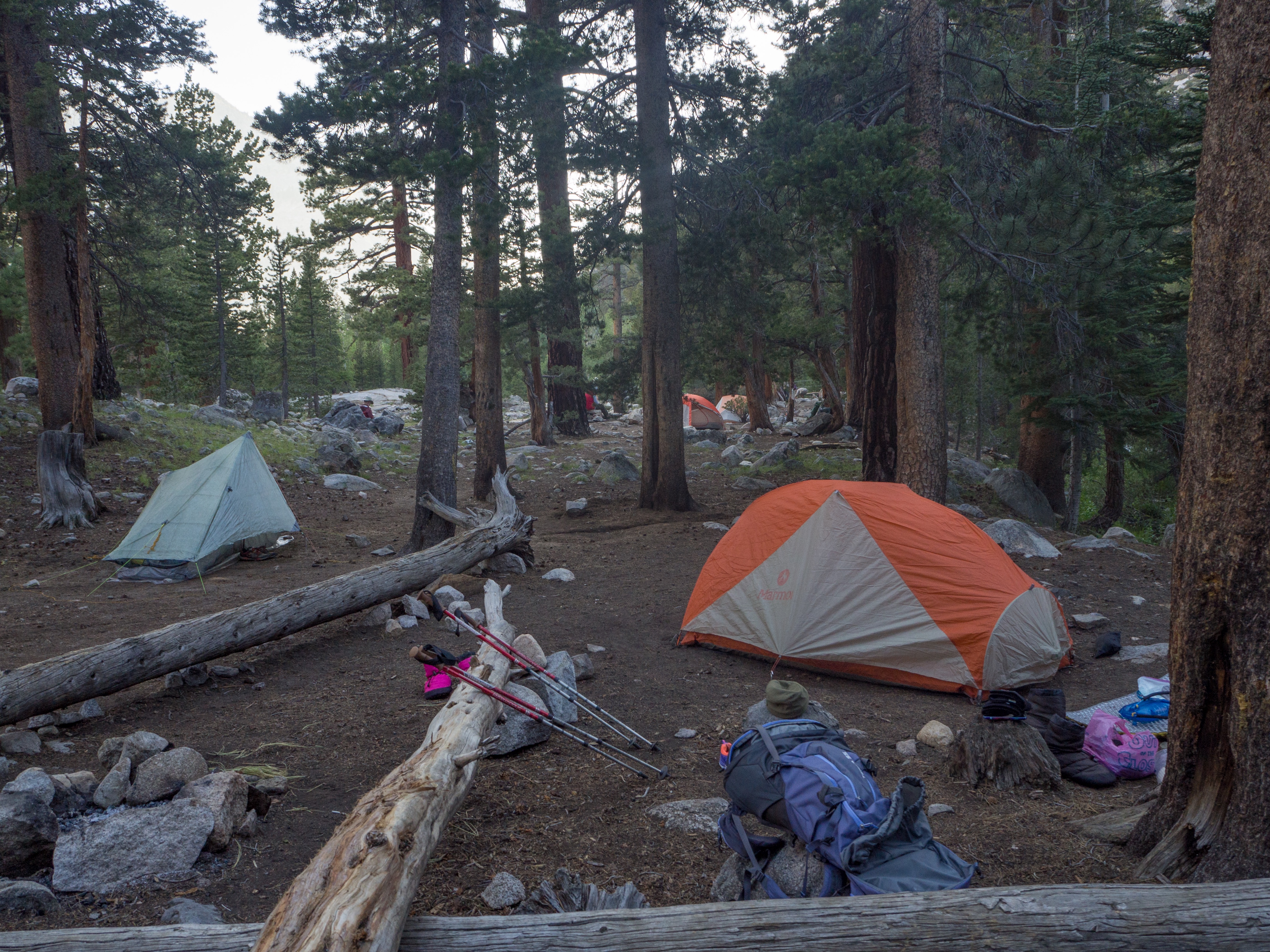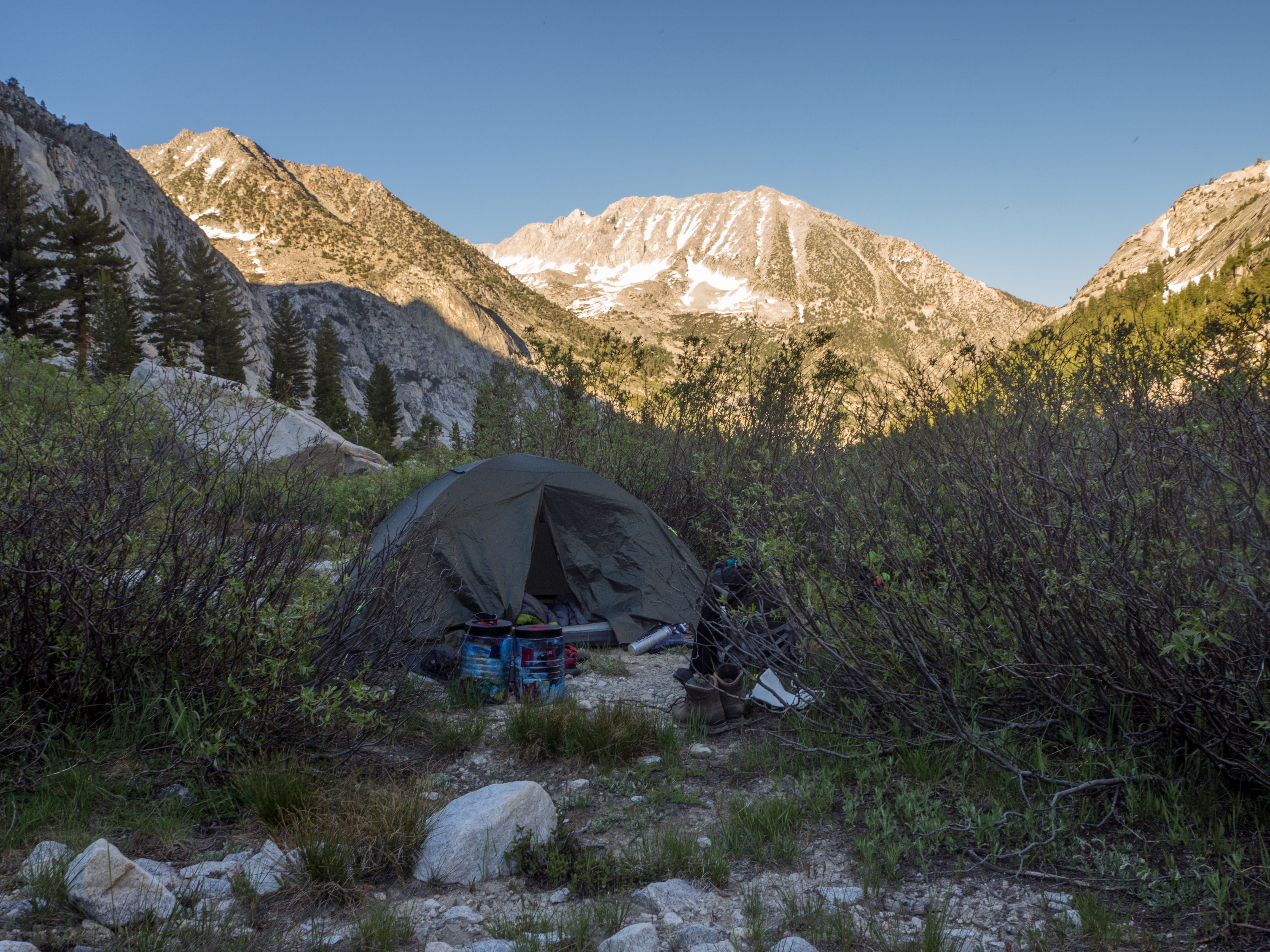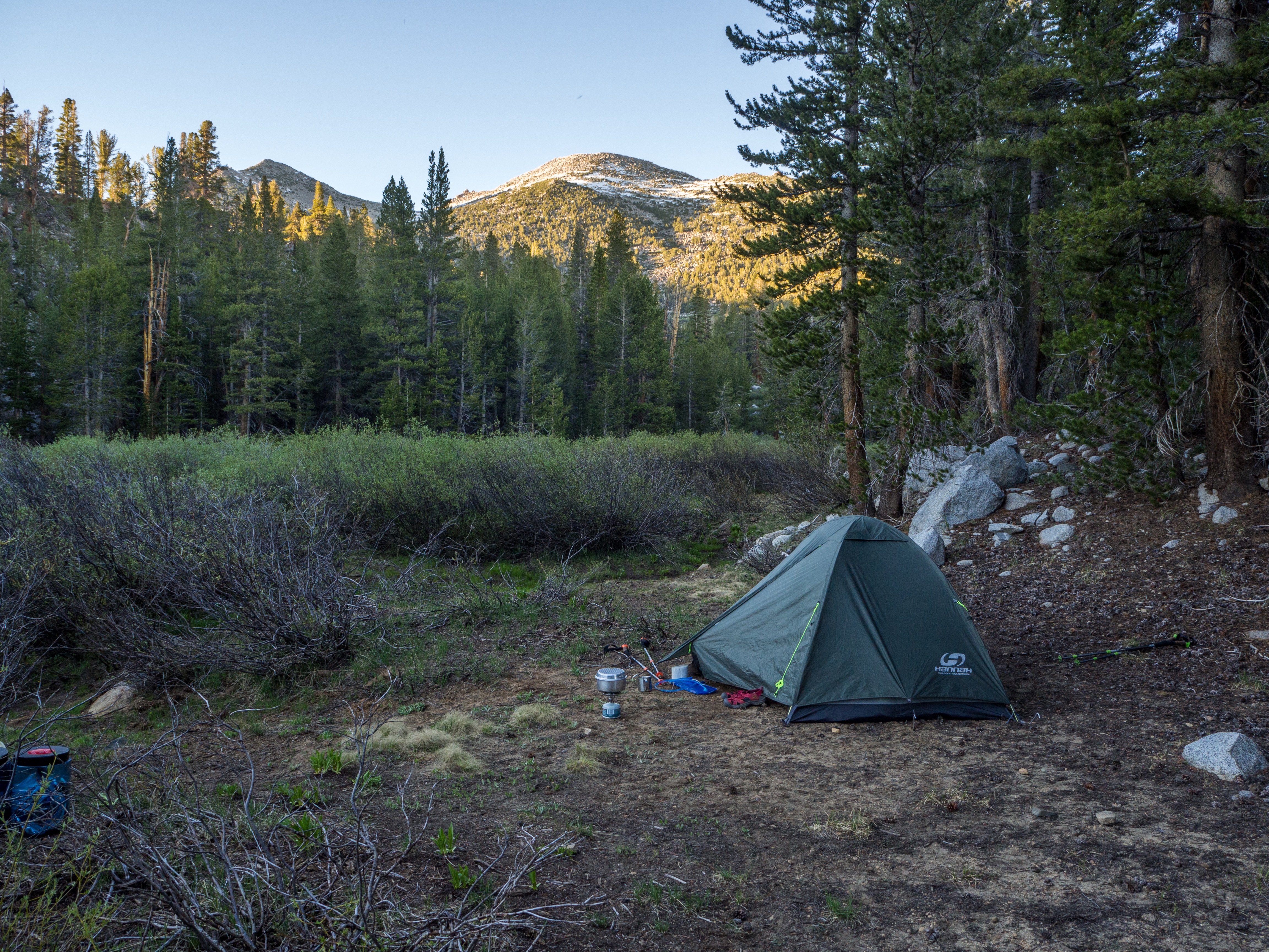 Říkáme si, že máme ještě spoustu sil a půjdeme o pár mil výše, přiblížit se průsmyku Muir Pass, který nás čeká druhý den. Ale přecenili jsme síly a tak budeme kempovat mimo oficiální kemp. Stačí se uklidit alespoň 30m od cesty. Do camel bagu jsme nabrali 2l vody, abychom se zase nemuseli dělit o teplo s hromádkou sněhu. Camel bag jinak ani nevyužíváme, protože voda je všude. Nosíme si dohromady jen jeden litr vody.