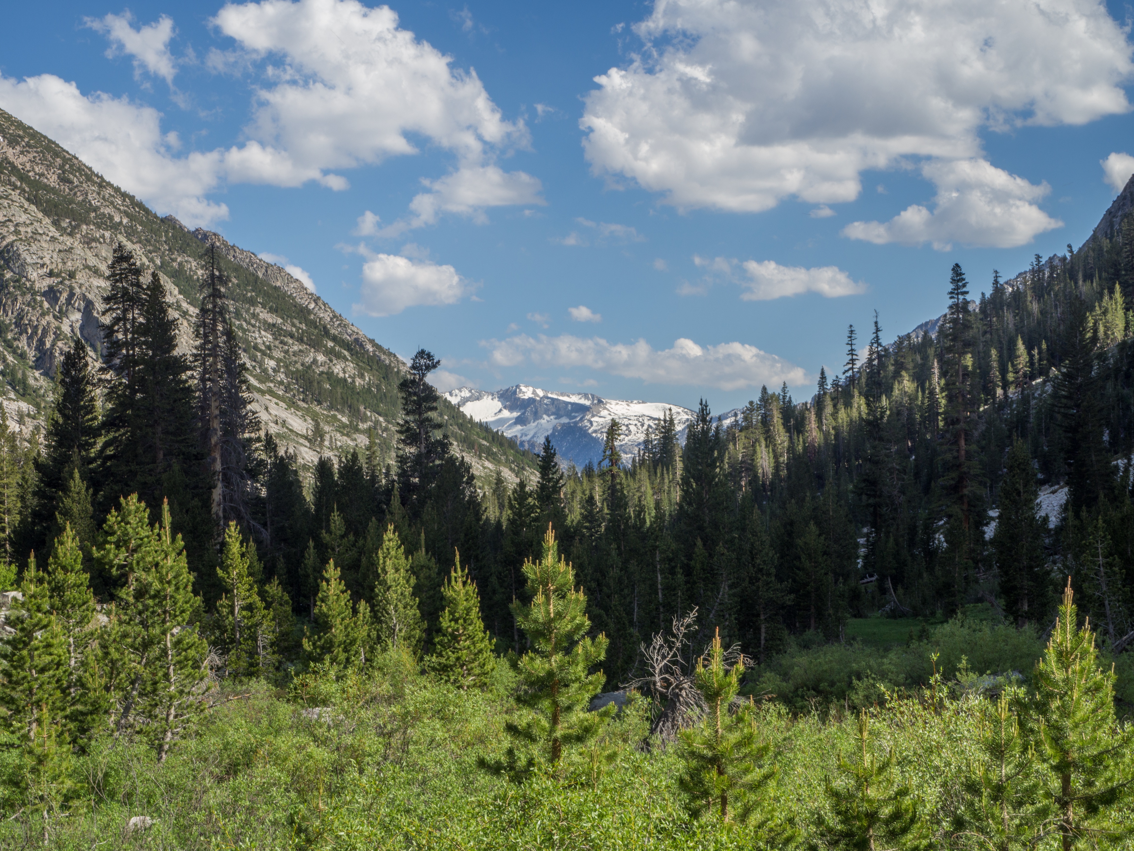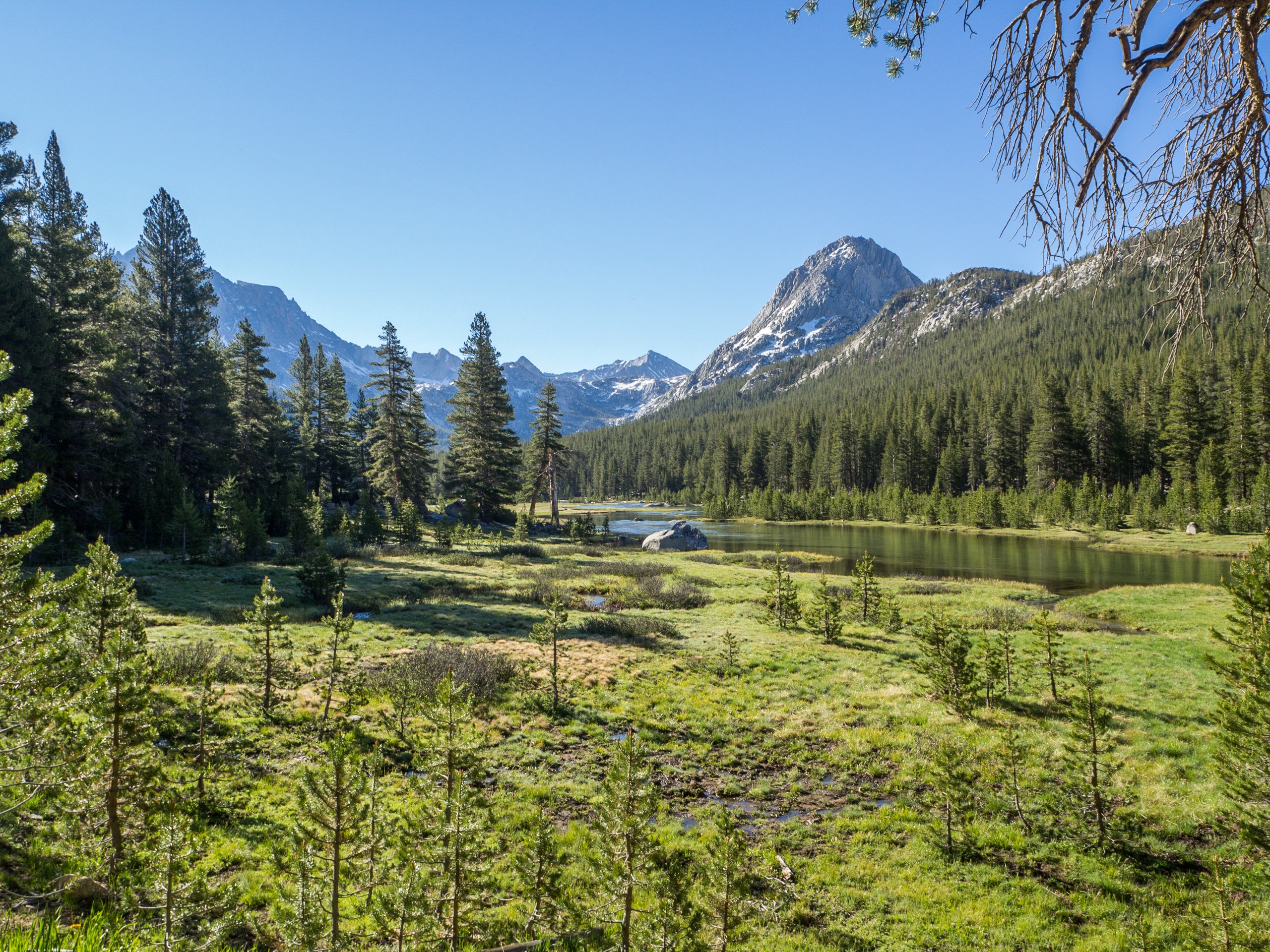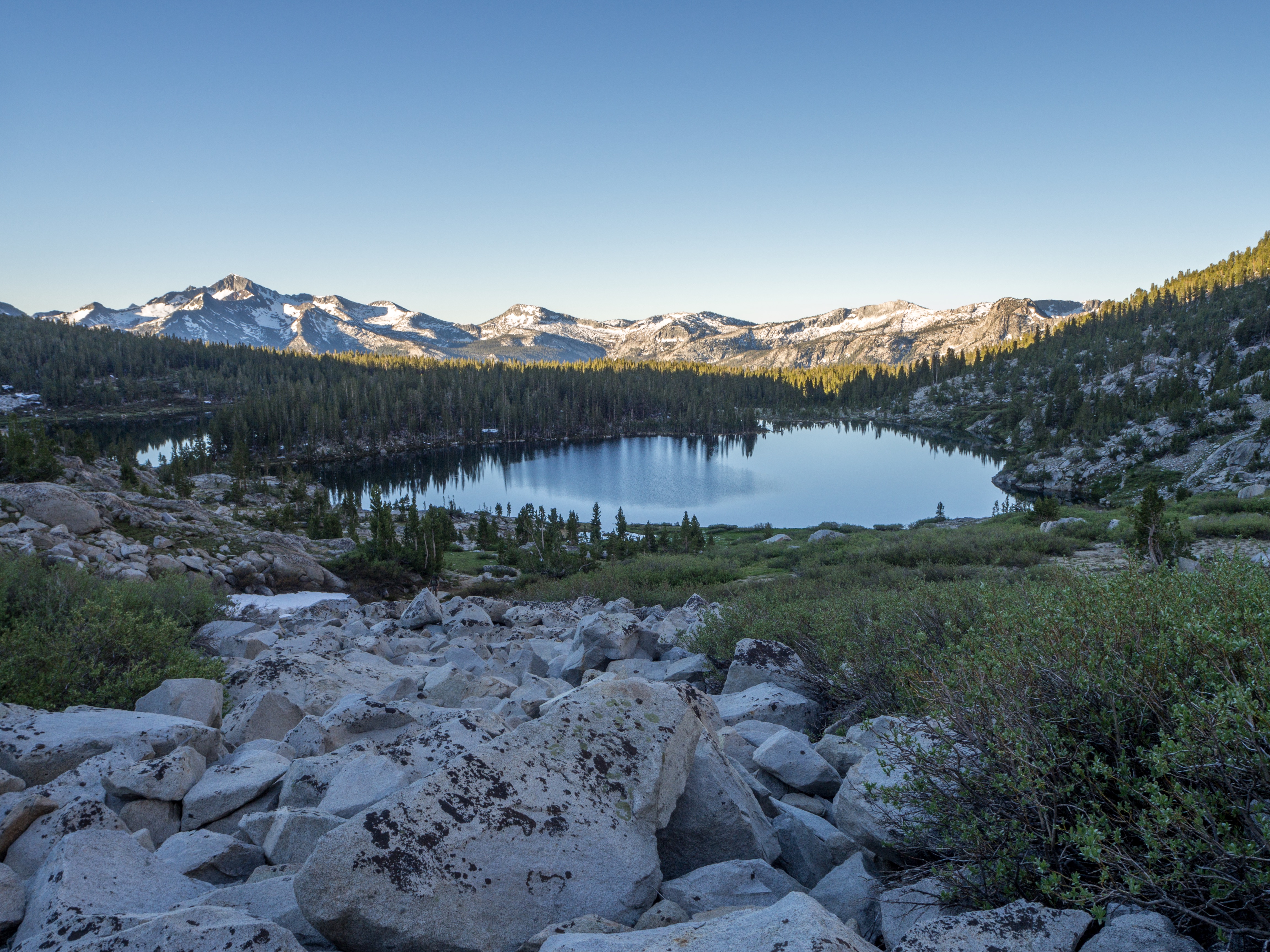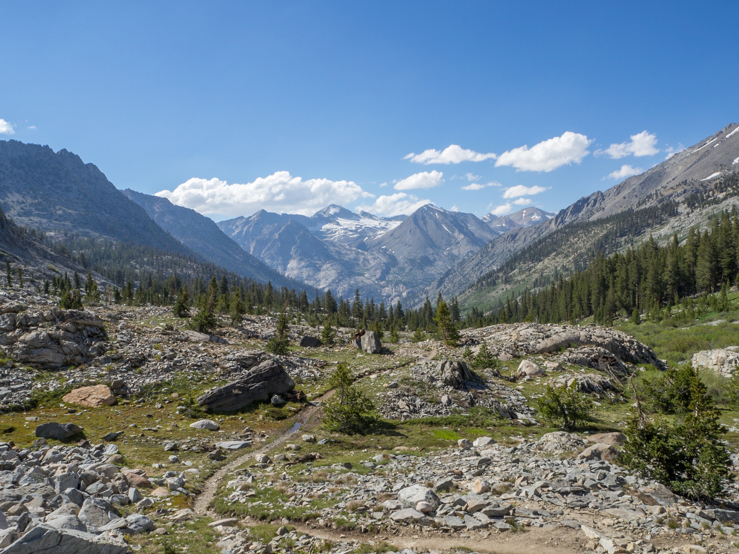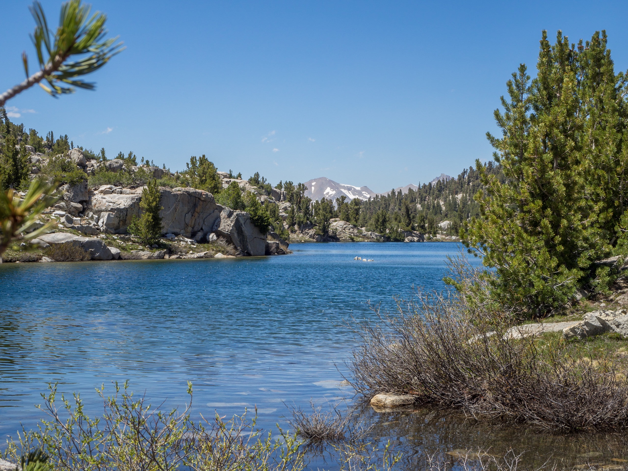 Sněhová pole naštěstí skončí a my sestupujeme dále po suché cestě kolem Evolution lake, kde si skočíme na koupel. Pak budeme pokračovat dolů do lesů. Když jsme tam dorazili tak jsme poprvé poznali, proč s sebou neseme klobouky se sítí proti komárům. Byli všude, miliony a jdou i přes oblečení. Náš Predator sprej naštěstí funguje minimálně dvě hodiny.