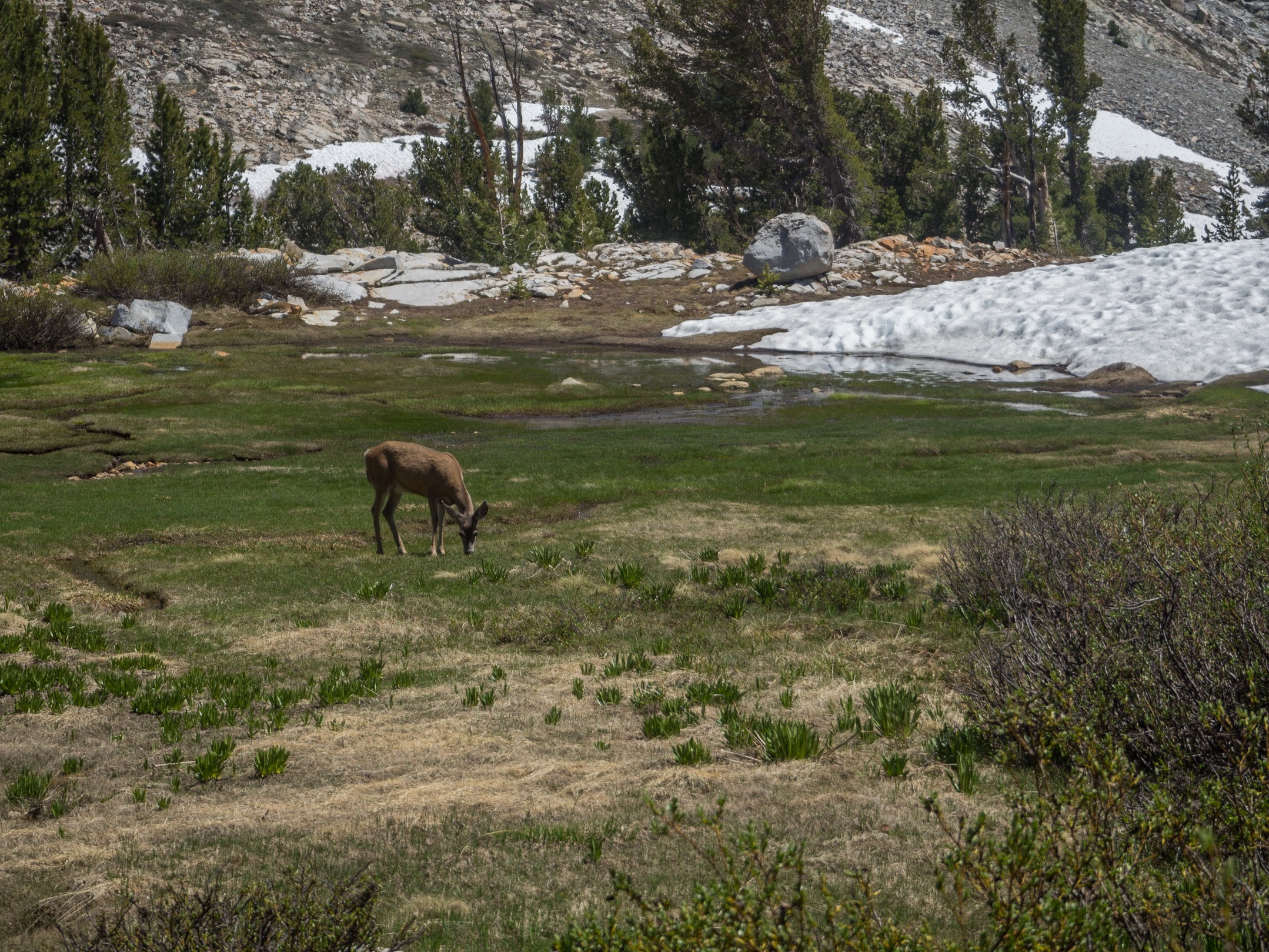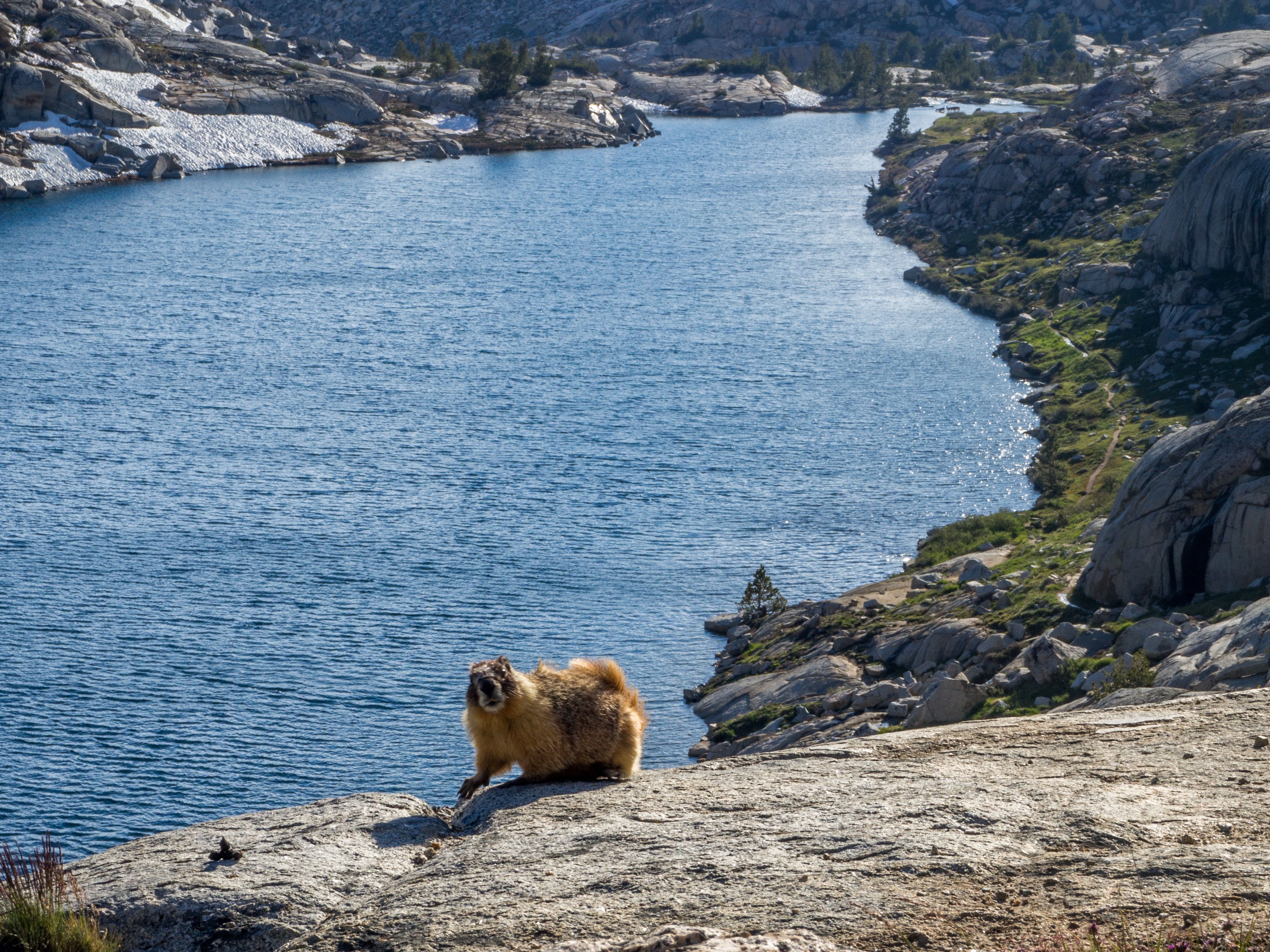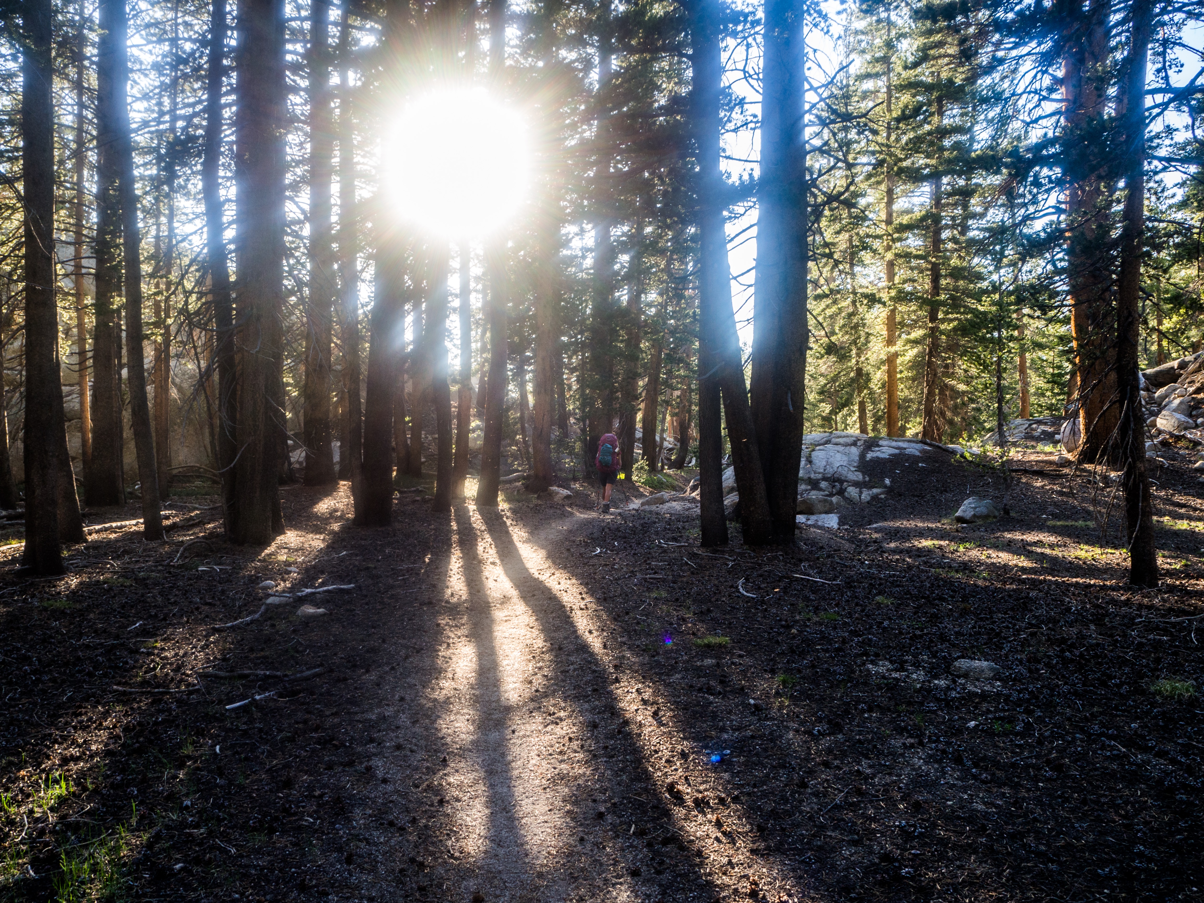 Je to hodně zvláštní den, nikoho nepotkáváme. Většinou se potkáváme se skupinou Američanů, kteří mají podobné tempo, nebo jinými hikery, kteří nás předbíhají nebo JMT hikery, kteří jdou v protisměru. John Muir Trail (JMT) začíná totiž v Yosemitte Valley a končí u Mt. Whitney. Ale dnes jsme nepotkali ani nohu a je to zvláštně nepříjemné, skoro si říkáme, jestli nejdeme špatně.