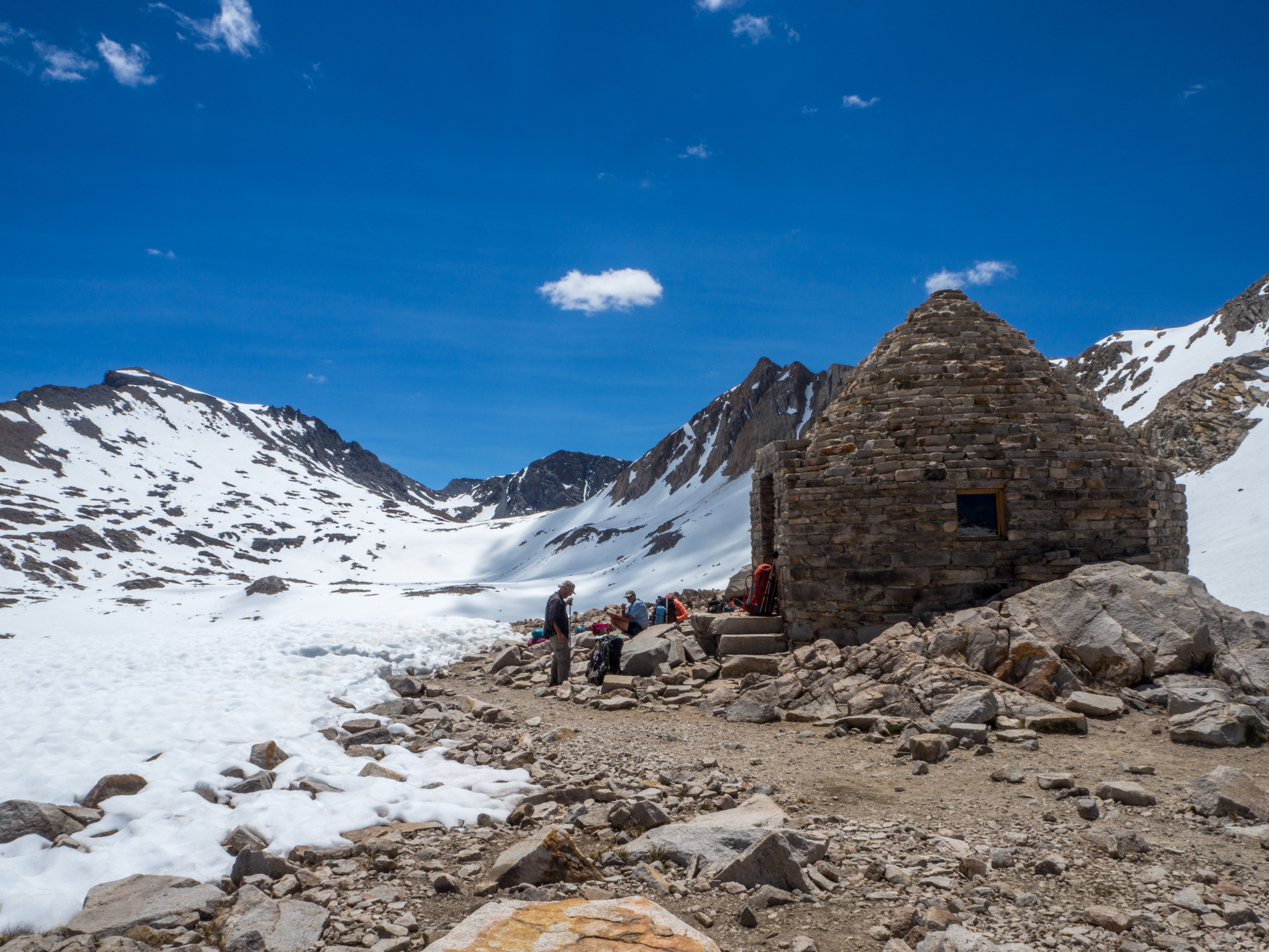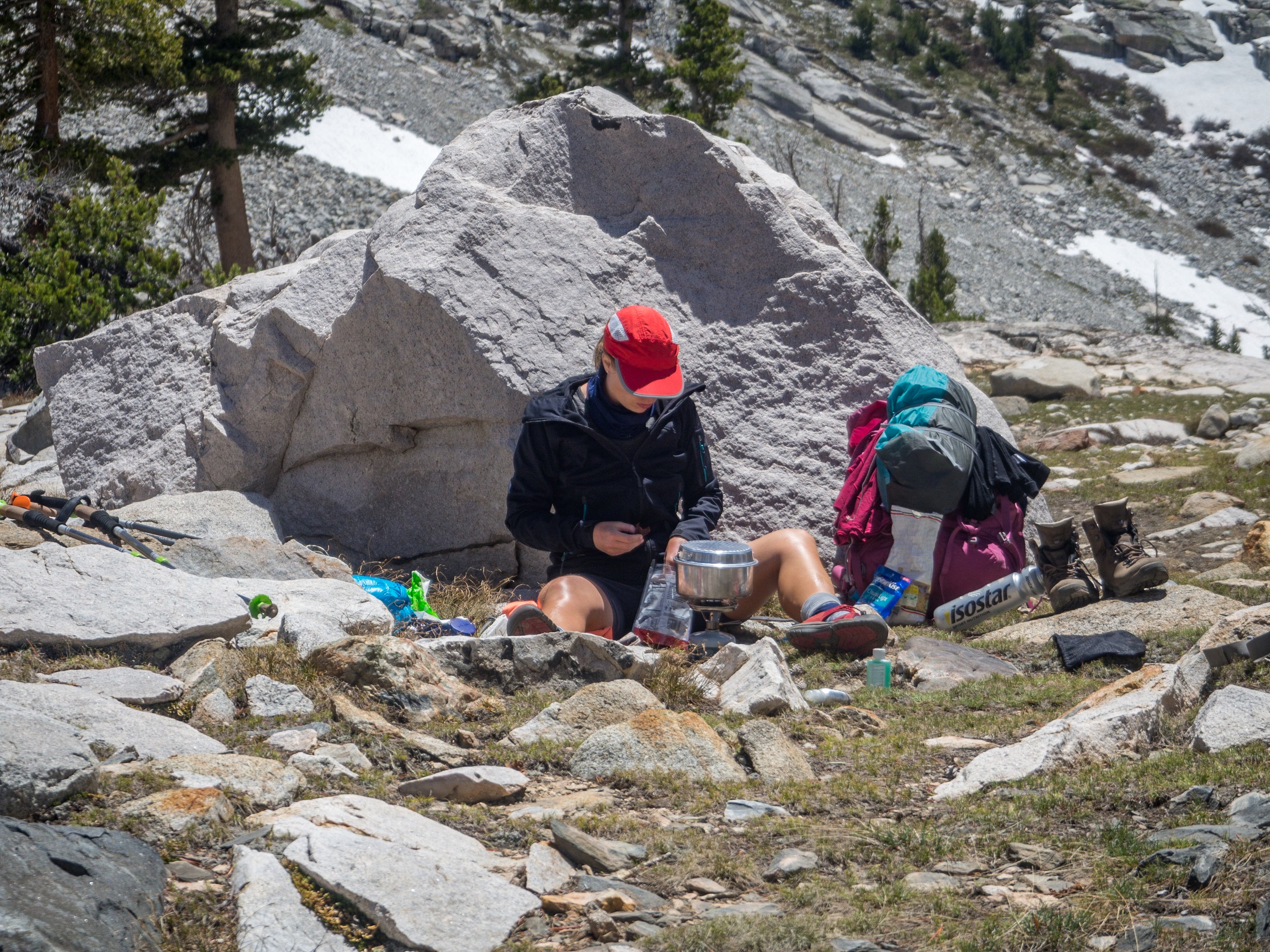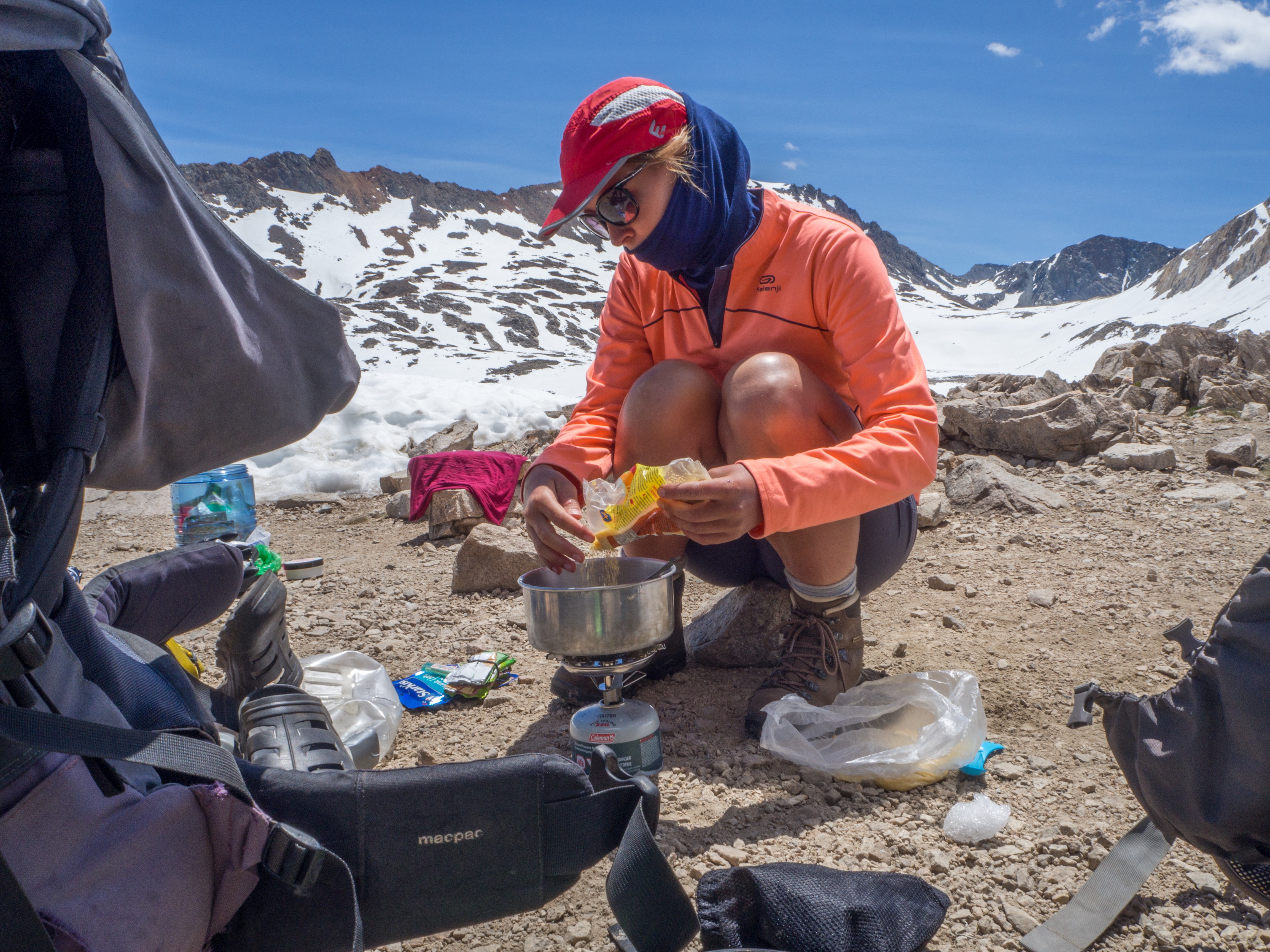 Na vrcholu Muir Passu (3648) se tyčí kryt pro hikery pro případ velmi špatného počasí. My máme, zatím jako každý den, slunné počasí bez mráčku a tak pár lidí kryt využilo pro vaření oběda, protože tam nefouká. Nám došla voda. Neměli jsme už hodiny žádnou vodu a tak jsme obětujeme hromadu plynu na uvaření oběda a čaje ze sněhu. Na vrcholku je spousta lidí a panuje veselá nálada. Poznali jsme tu pár lidí a mimo jiné tu s námi je Ivanka i Wild Turtle. Do seznamu přátel na cestě jsme přidali i pár se Singapuru, které ještě několikrát potkáme.