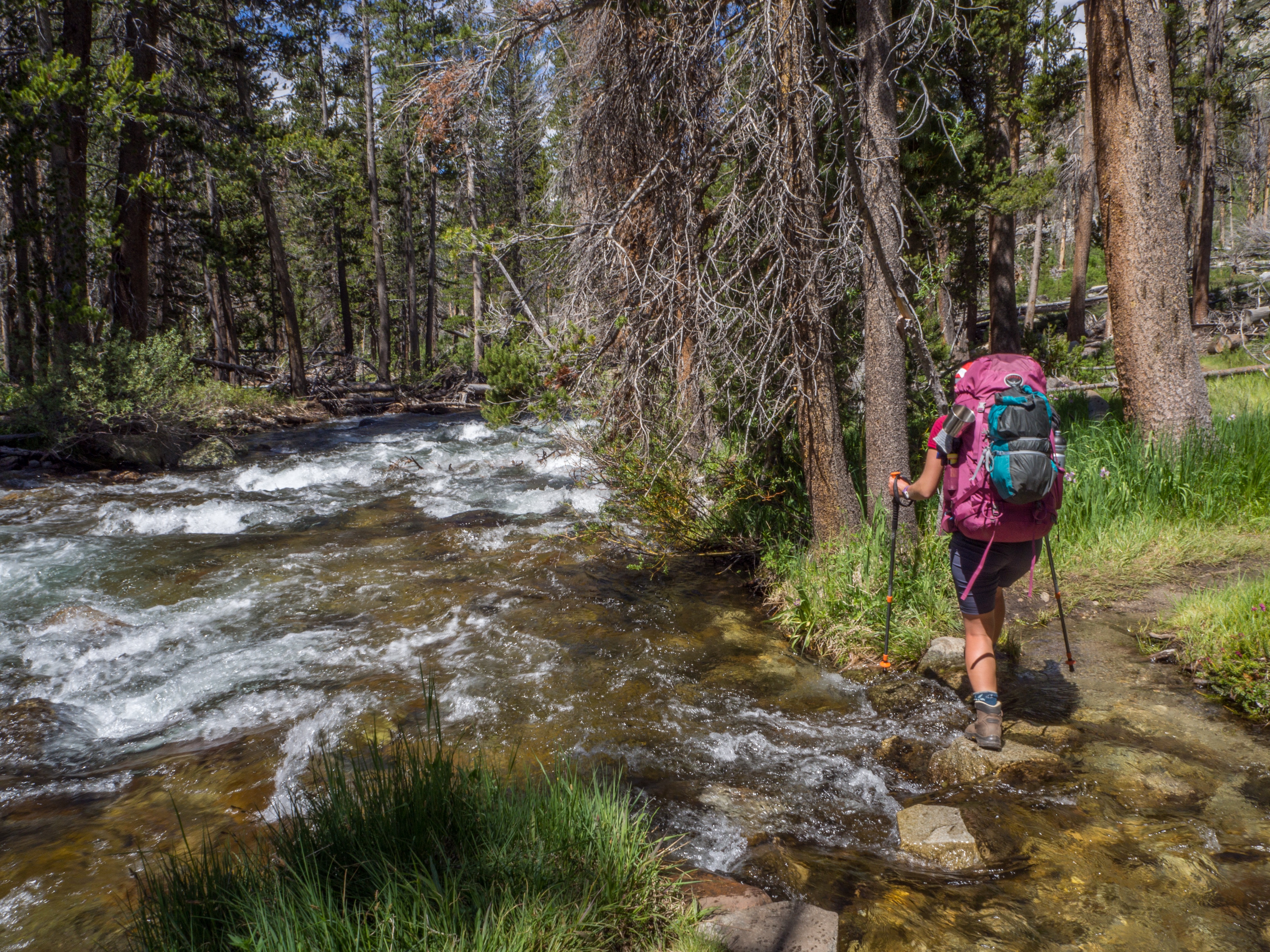 Do Reds Meadows je to 45km takže bychom tam měli být zítra večer. Ráno nás čeká převoz přes přehradu Edison Lake a pak přes kilometr převýšení na 10km. To bude asi fuška. A byla. Během volného dne jsme udělali tu chybu, že jsme se nešli třeba projít a samotné protahování nezabránilo tomu, abychom úplně neztuhli. Dnes s námi na cestu vyrazila Ivanka, máme přecházet silnou řeku, která včera večer strhla nějakého hikera a odnesla několik metrů. Ivanka nechce jít sama, protože to je nebezpečné. Na tu řeku jsme narazili asi po 3 km. Naštěstí bylo ještě ráno a řeka nebyla ještě tolik rozvodněná a tak se dala s opatrností přejít. I další dva obávané brody byly méně rozvodněné, než jak jsme očekávali.
