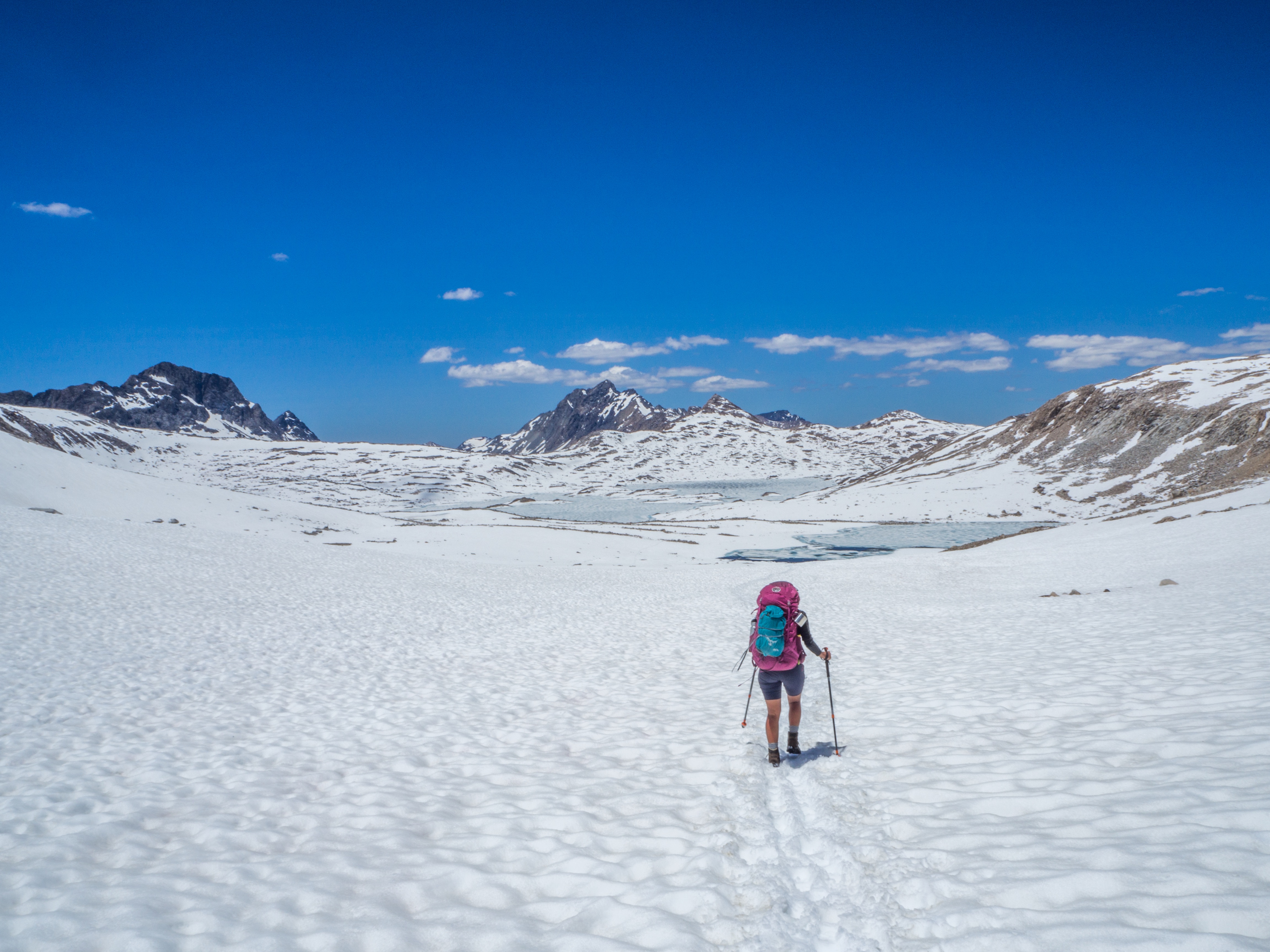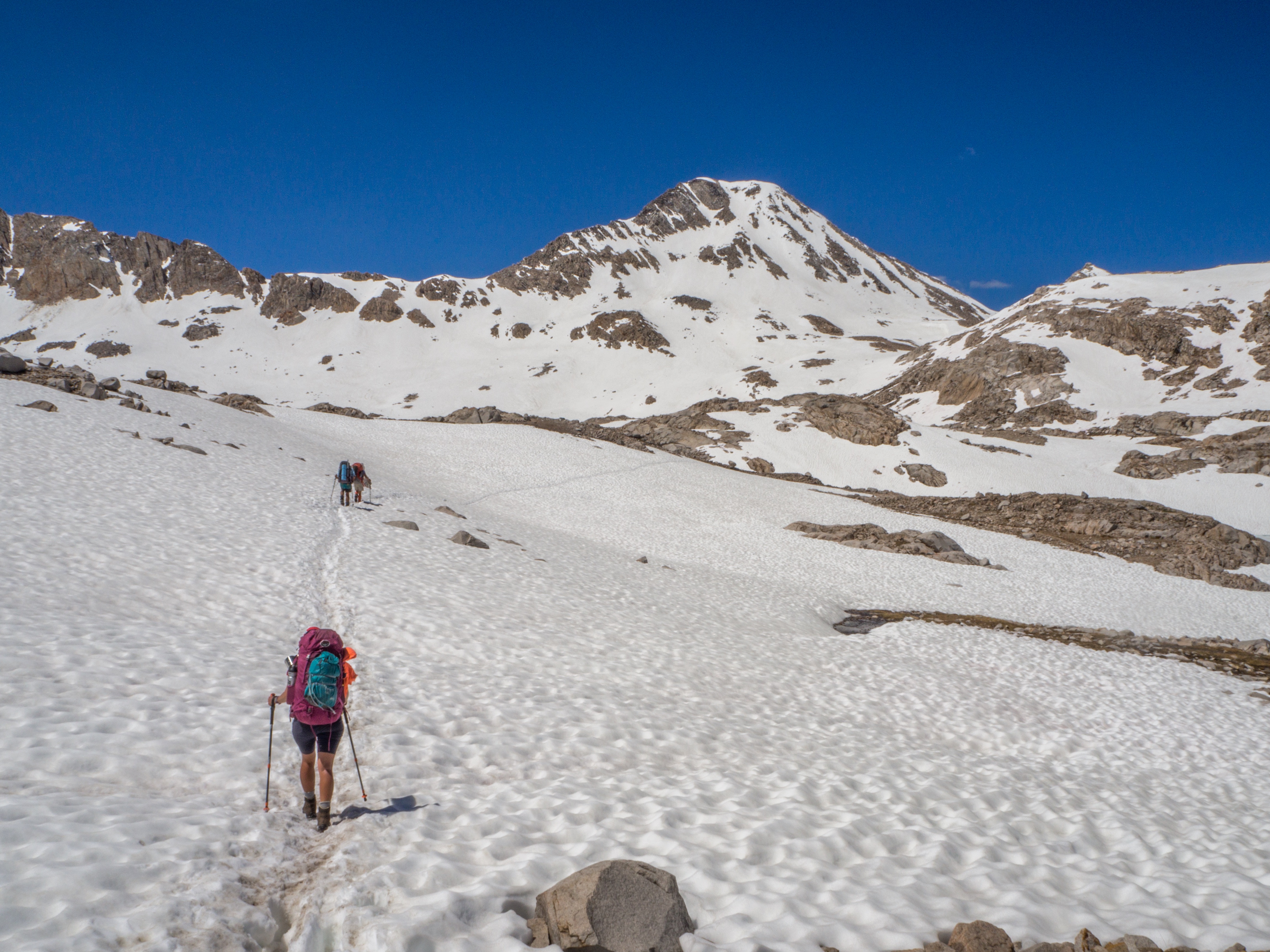Dnes nás čeká prý nejnáročnější průsmyk a to kvůli sněhu, který je asi 6km před i za průsmykem a kolem není nic, co by nabízelo stín. Začali jsme den vystoupáním 700m na 8km. Velkou část jsme museli přejít po sněhu. I když bylo ráno, sníh byl mokrý a těžký a často jsme se propadali až metr dolů. Části sněhu byli nad říčkou, takže jsme se propadali do vody. Všichni měli úplně promočené boty a i naše kožené pohory tady po hodinách ztratili poslední vrstvu impregnace.